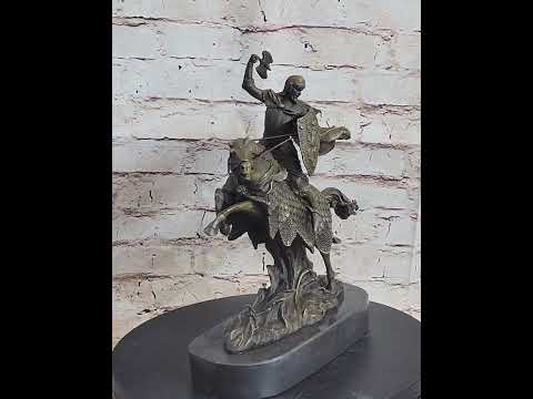 Crafted with exceptional skill using the lost-wax method of casting, this sculpture faithfully reproduces every intricate detail of the Viking and his steed. The rich brown patina finish enhances the visual depth, bringing out the fine details of the Viking's armor, the texture of the horse's mane, and the overall dynamic energy of the scene. The statue is securely mounted on a solid black marble base, which not only adds to its stability but also elevates its aesthetic appeal, making it a striking centerpiece.