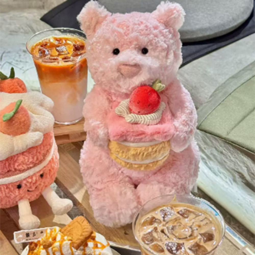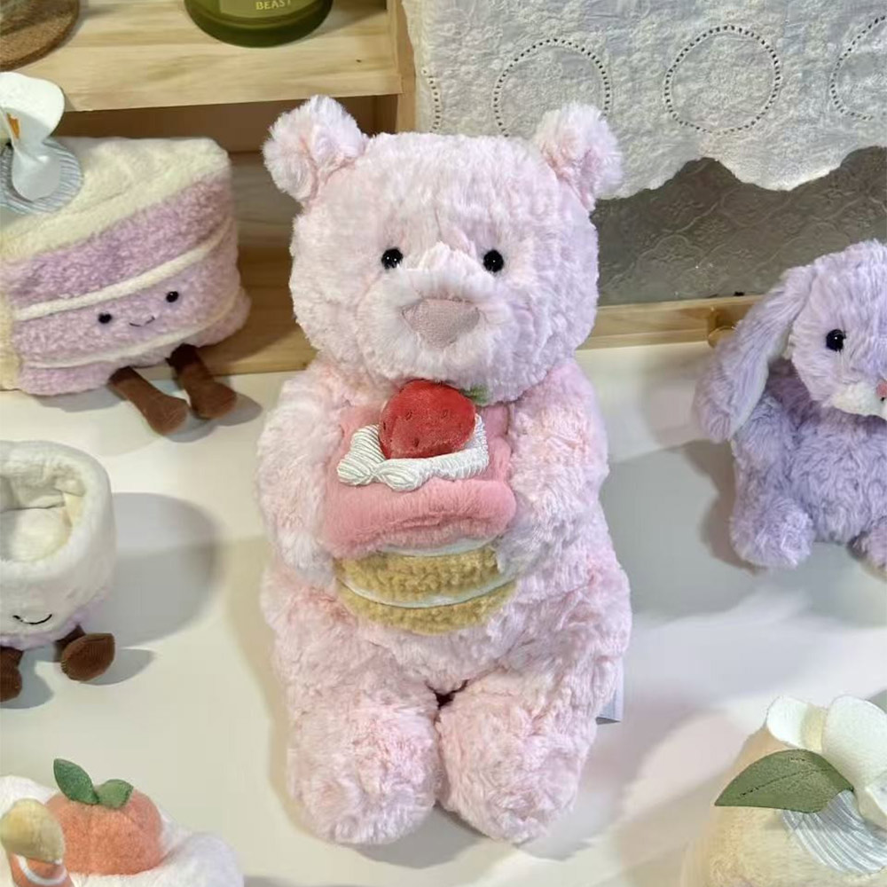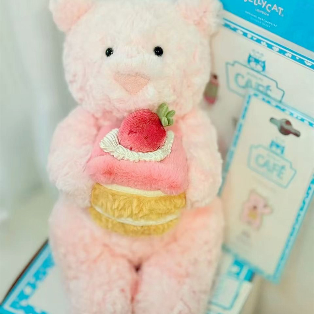 The Jellycat Amusable Shanghai Exclusive Cafe - Leola Bear with Strawberry Cake is a plush soft toy from the popular brand Jellycat.