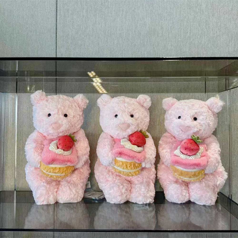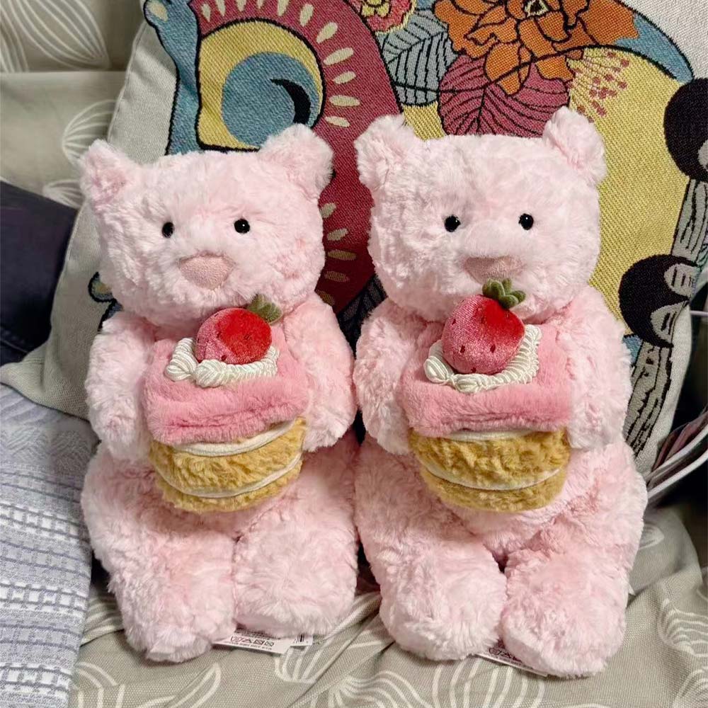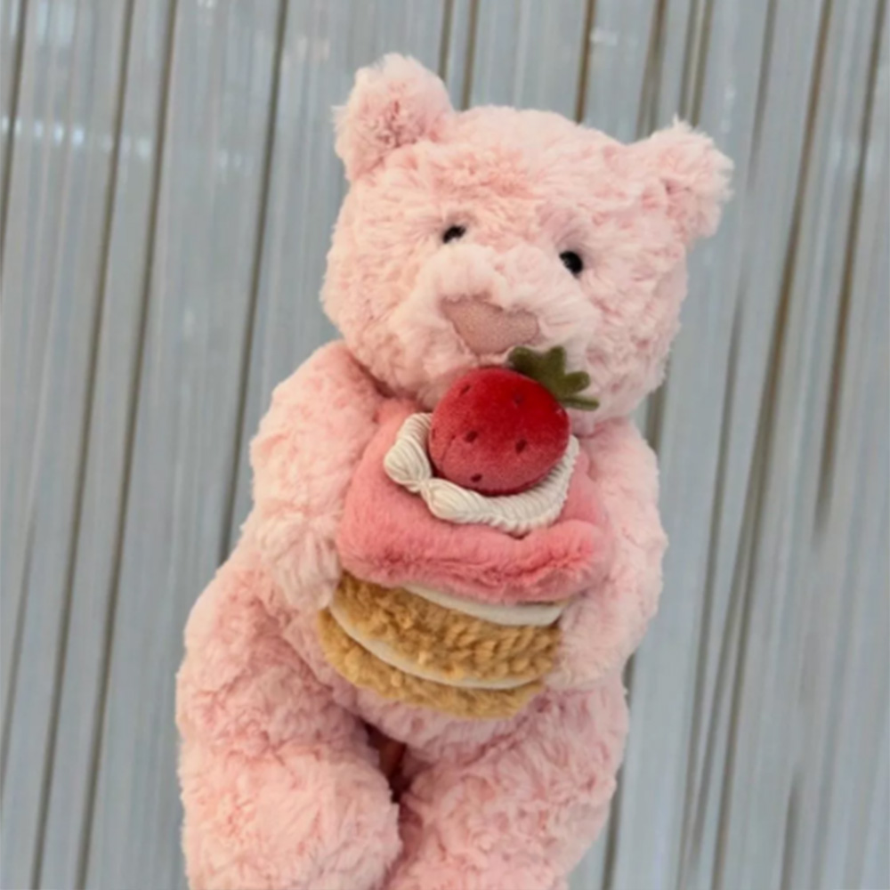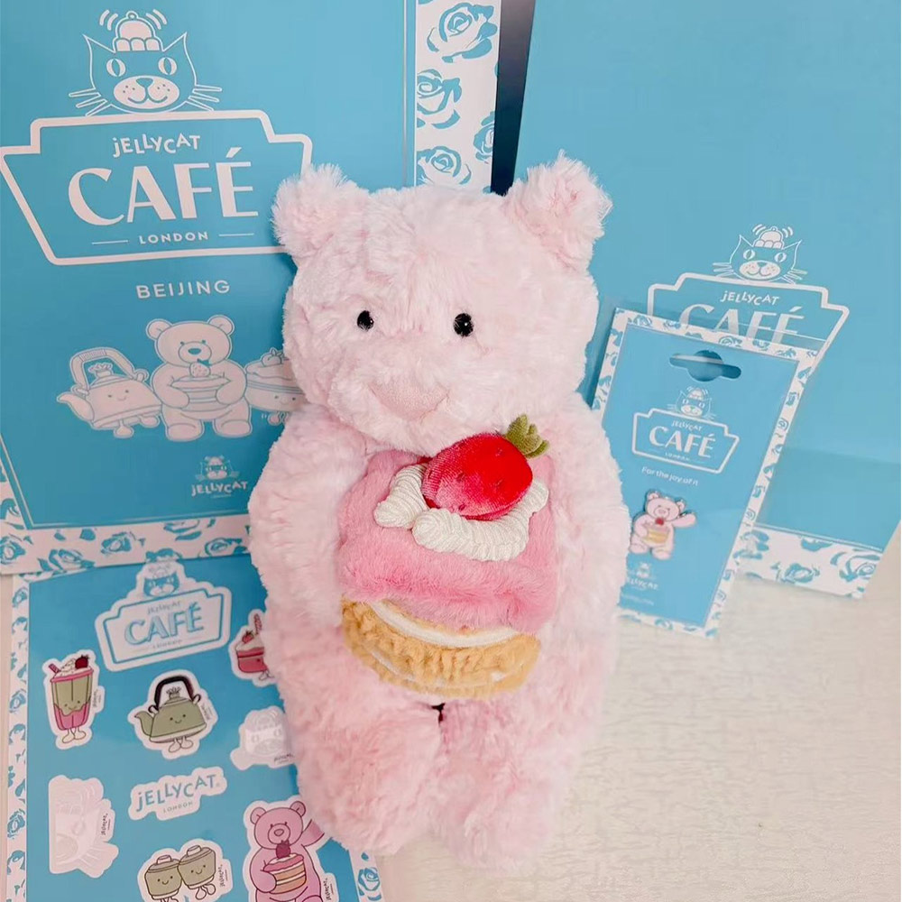 The Jellycat Amusable Shanghai Exclusive Cafe - Leola Bear with Strawberry Cake is a plush soft toy from the popular brand Jellycat.