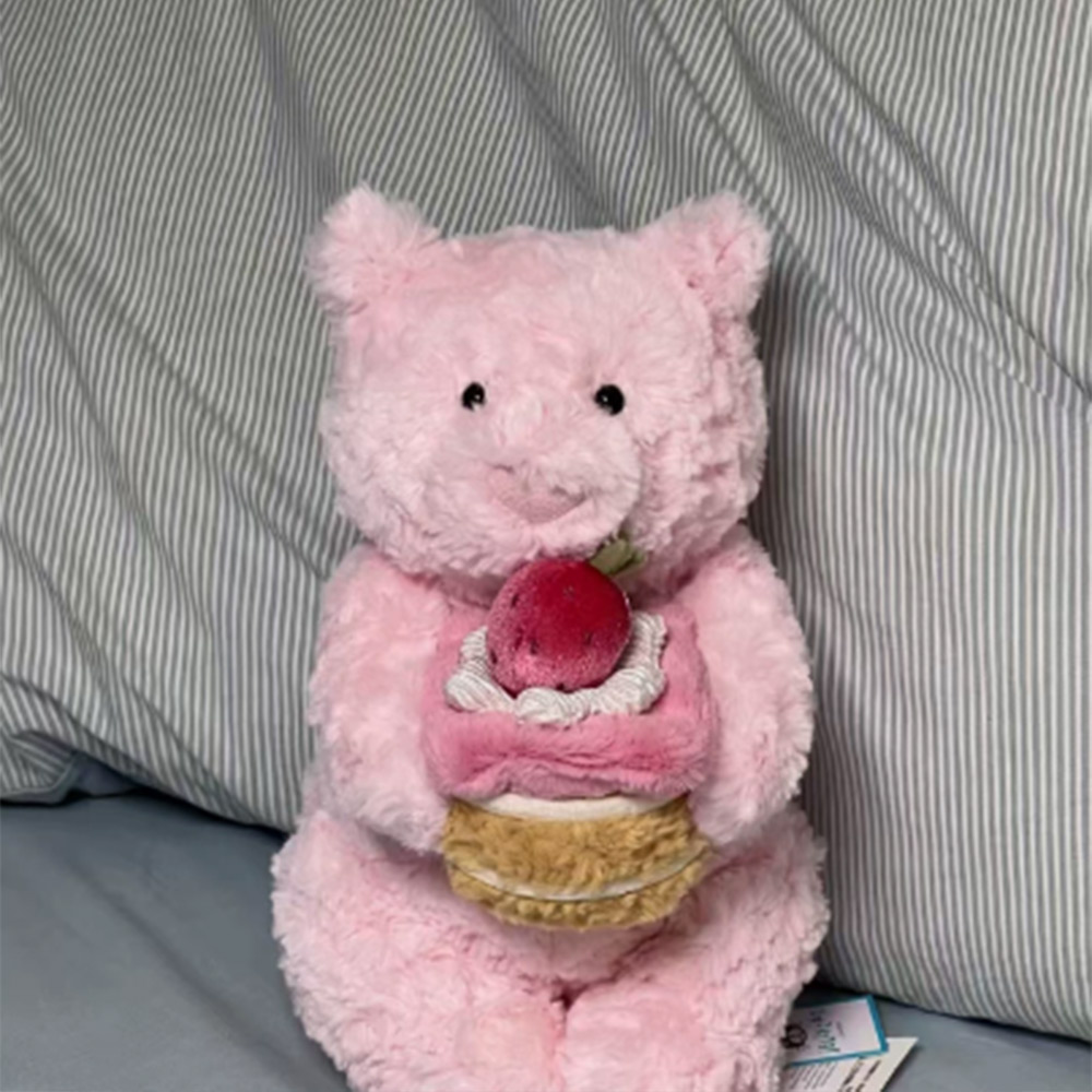 This modern soft toy features a cute pink colour and is designed with a strawberry cake accessory, making it a delightful addition to any toy collection.