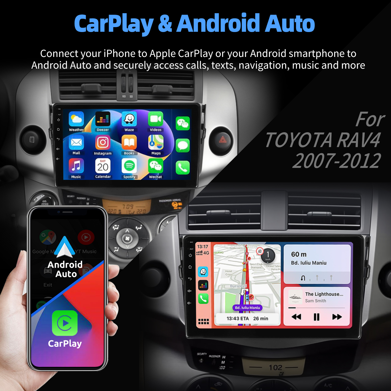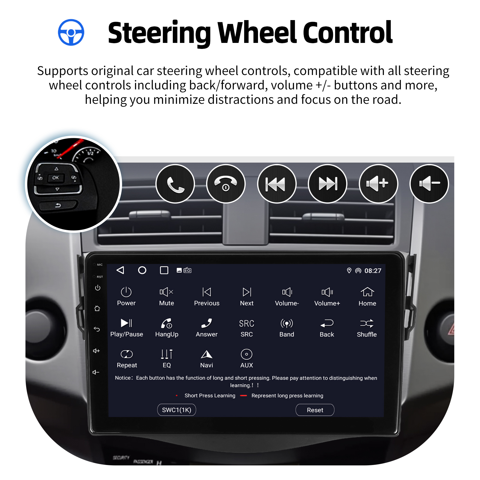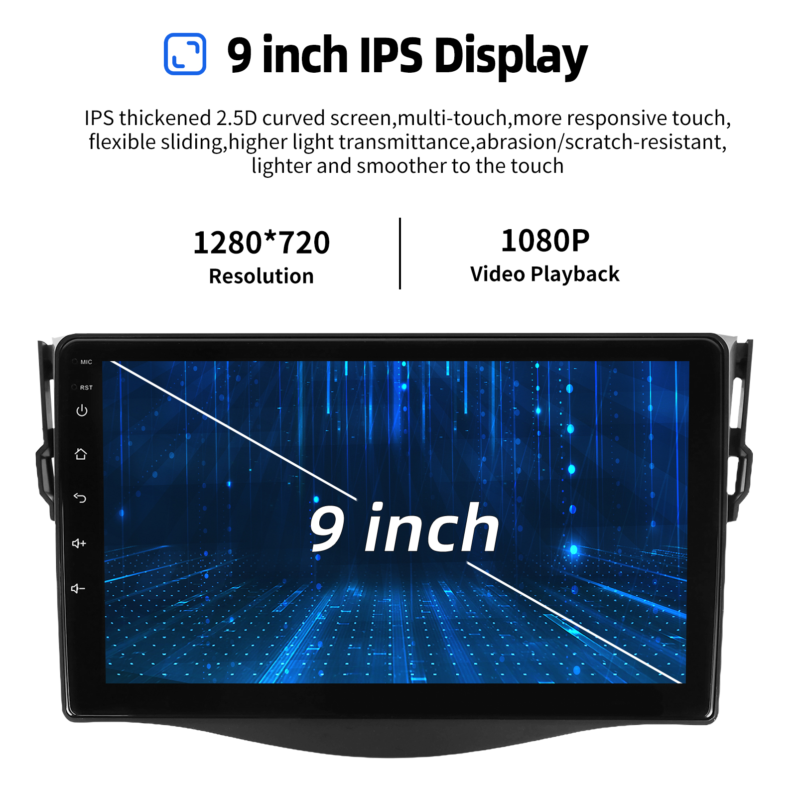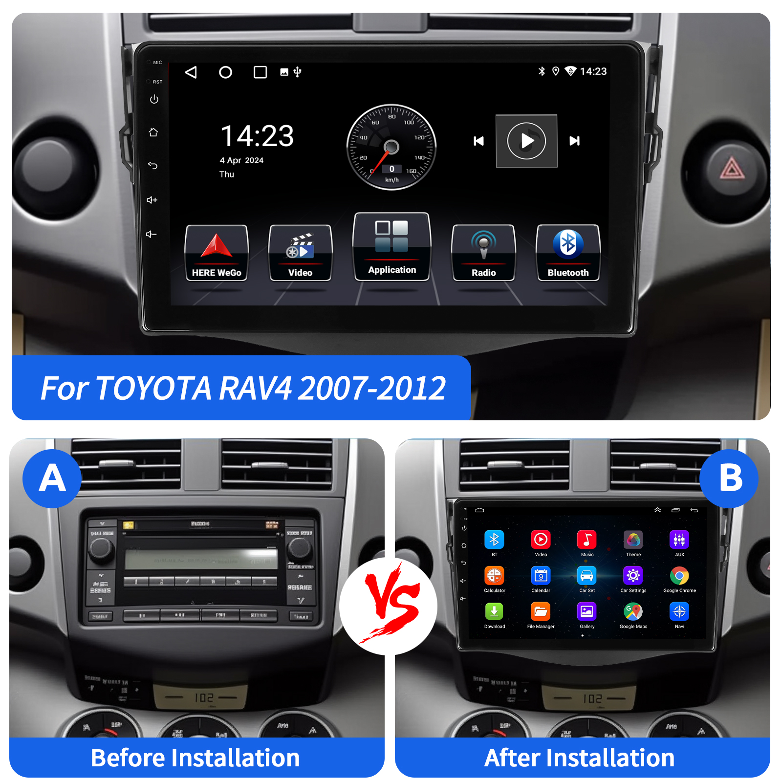 9 Inch Android 14 Car Radio For Toyota RAV4 2007-2012: The Android car radio with 9" 1280* 720 HD capacitive touchscreen, 2GB RAM and 32GB ROM allows you to download your favorite apps and videos, so driving is no longer boring. No extra frame, no cable change, plug and play. It comes with Canbus and supports most original functions: Steering wheel control, reverse signals and reading original computer data, etc.