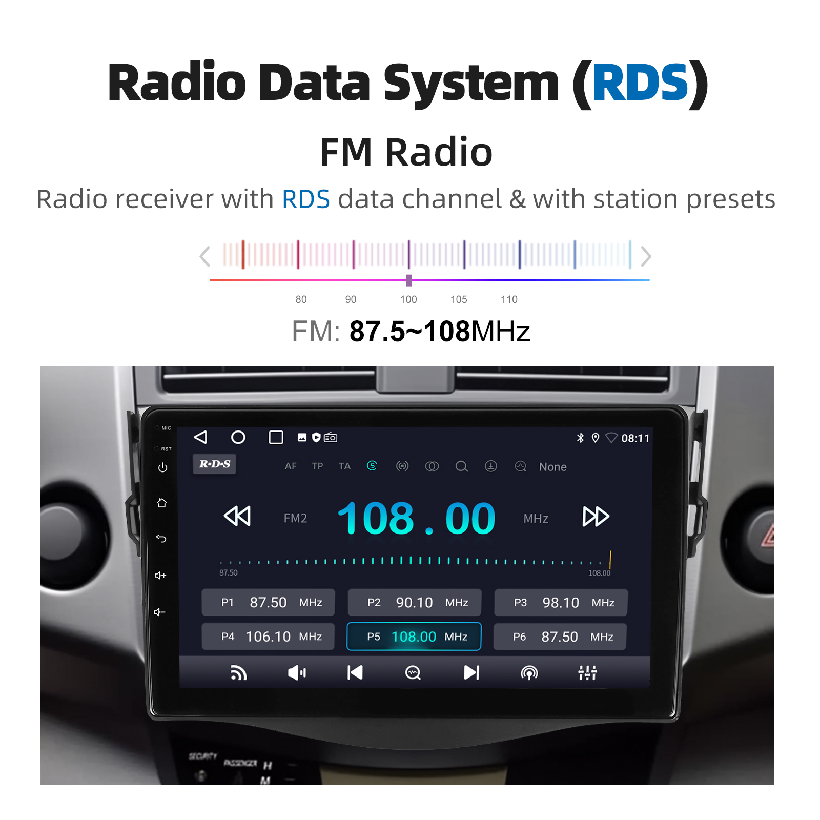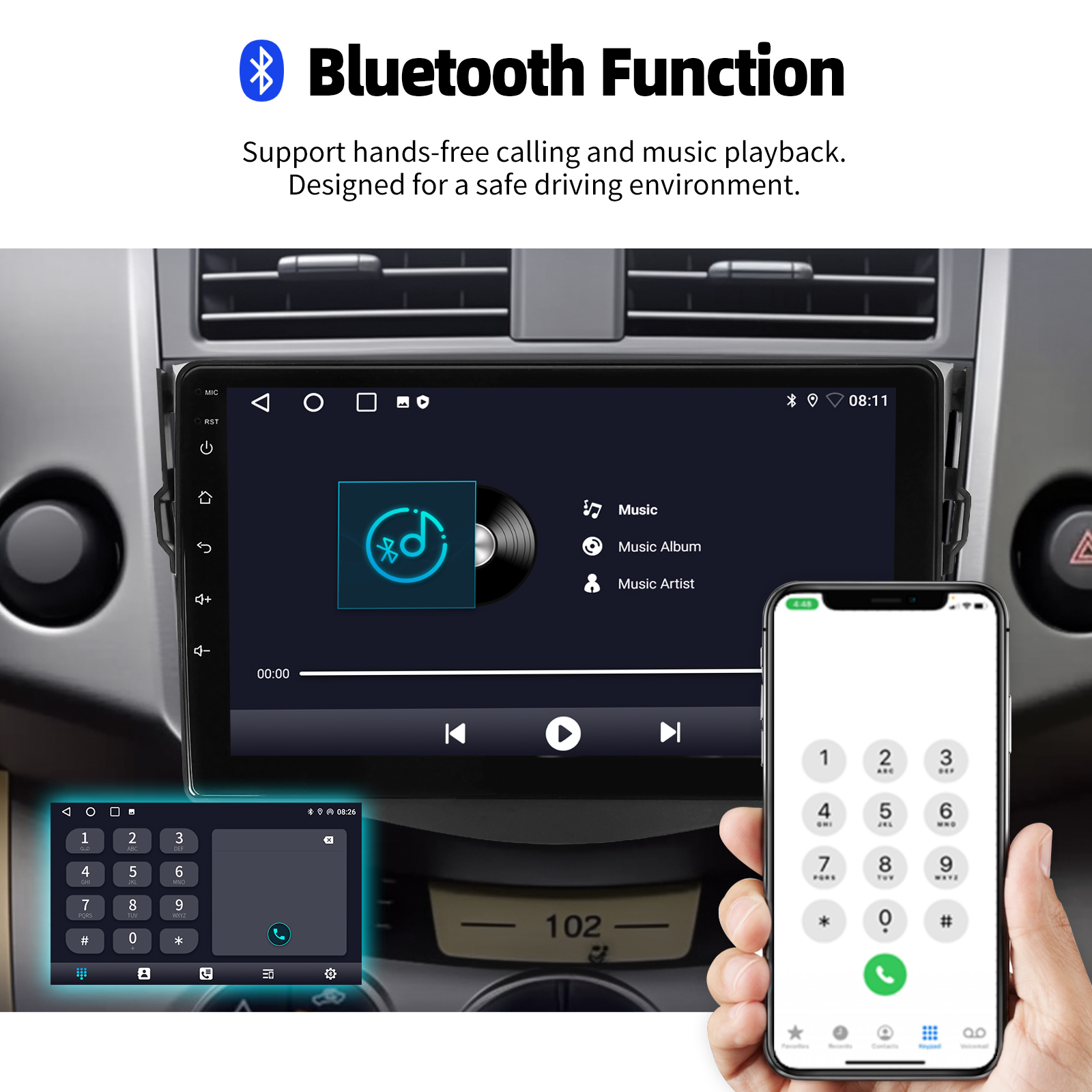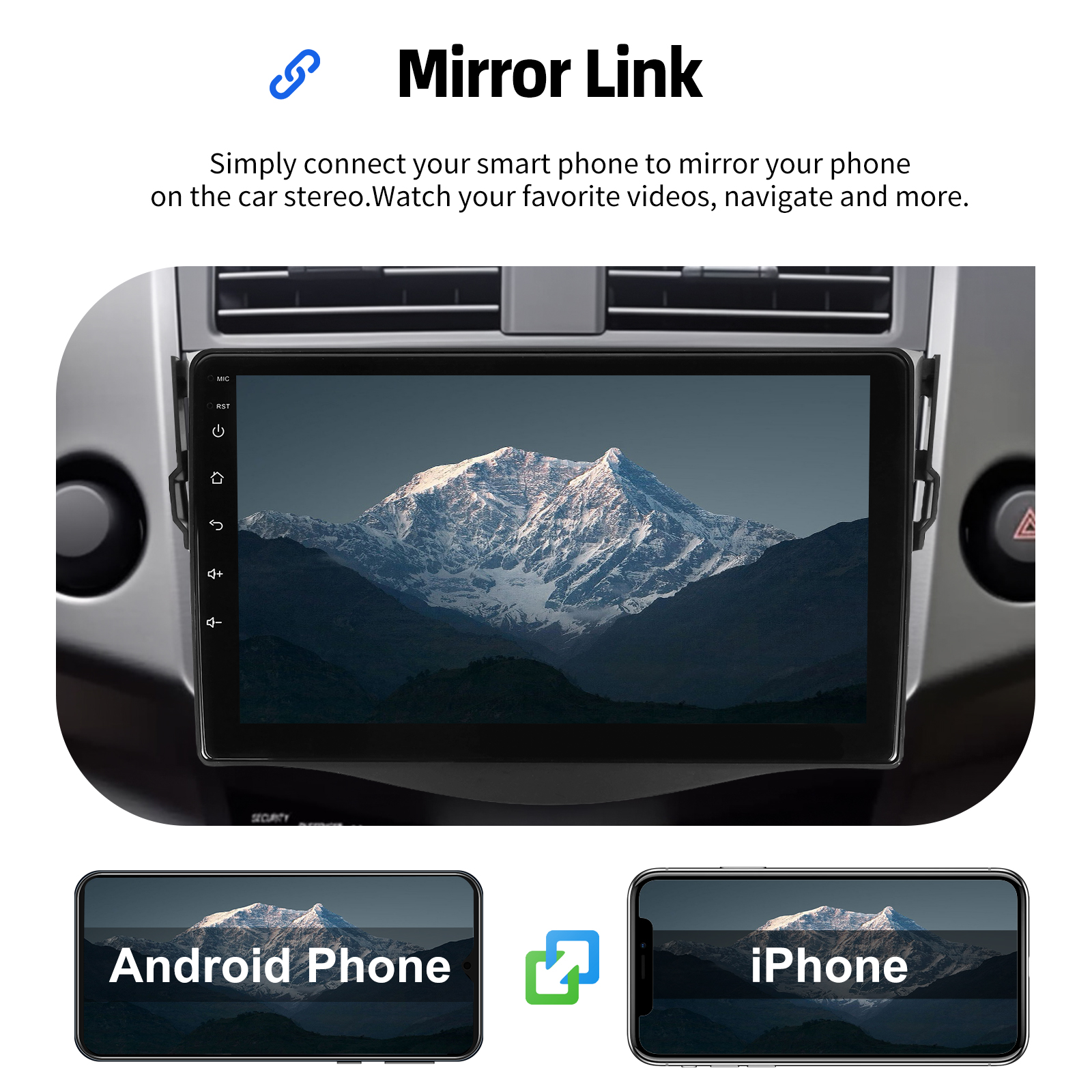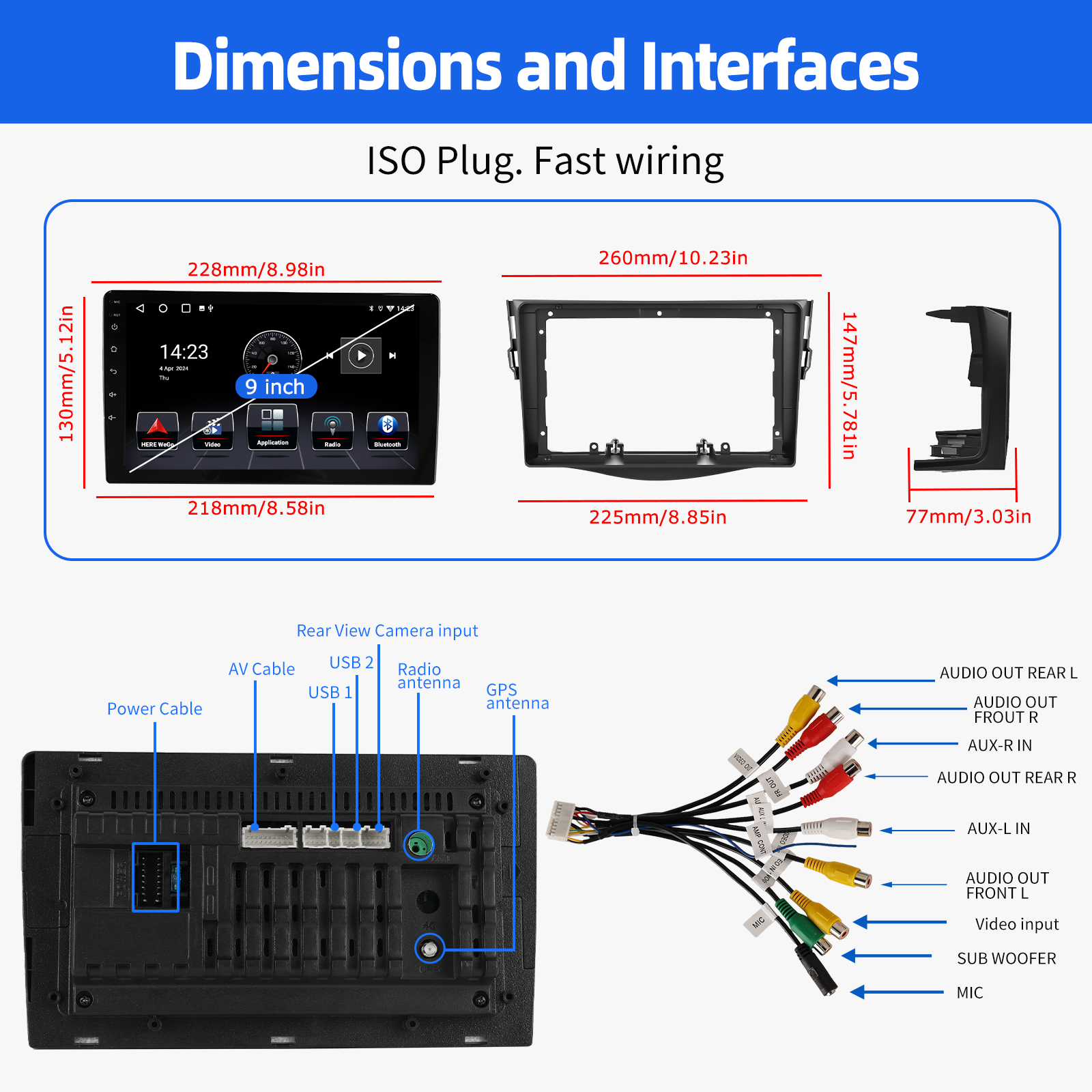 9 Inch Android 14 Car Radio For Toyota RAV4 2007-2012: The Android car radio with 9" 1280* 720 HD capacitive touchscreen, 2GB RAM and 32GB ROM allows you to download your favorite apps and videos, so driving is no longer boring. No extra frame, no cable change, plug and play. It comes with Canbus and supports most original functions: Steering wheel control, reverse signals and reading original computer data, etc.