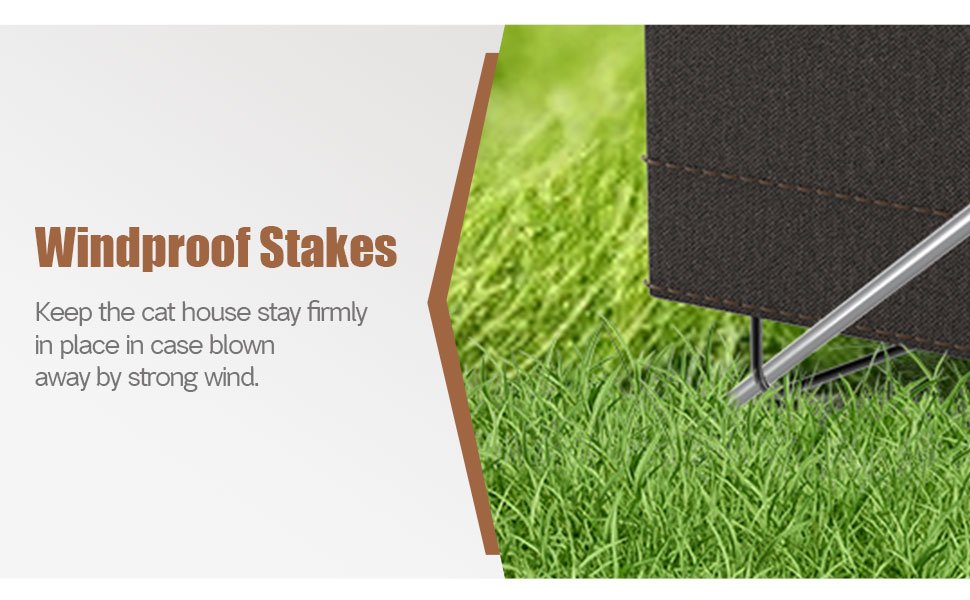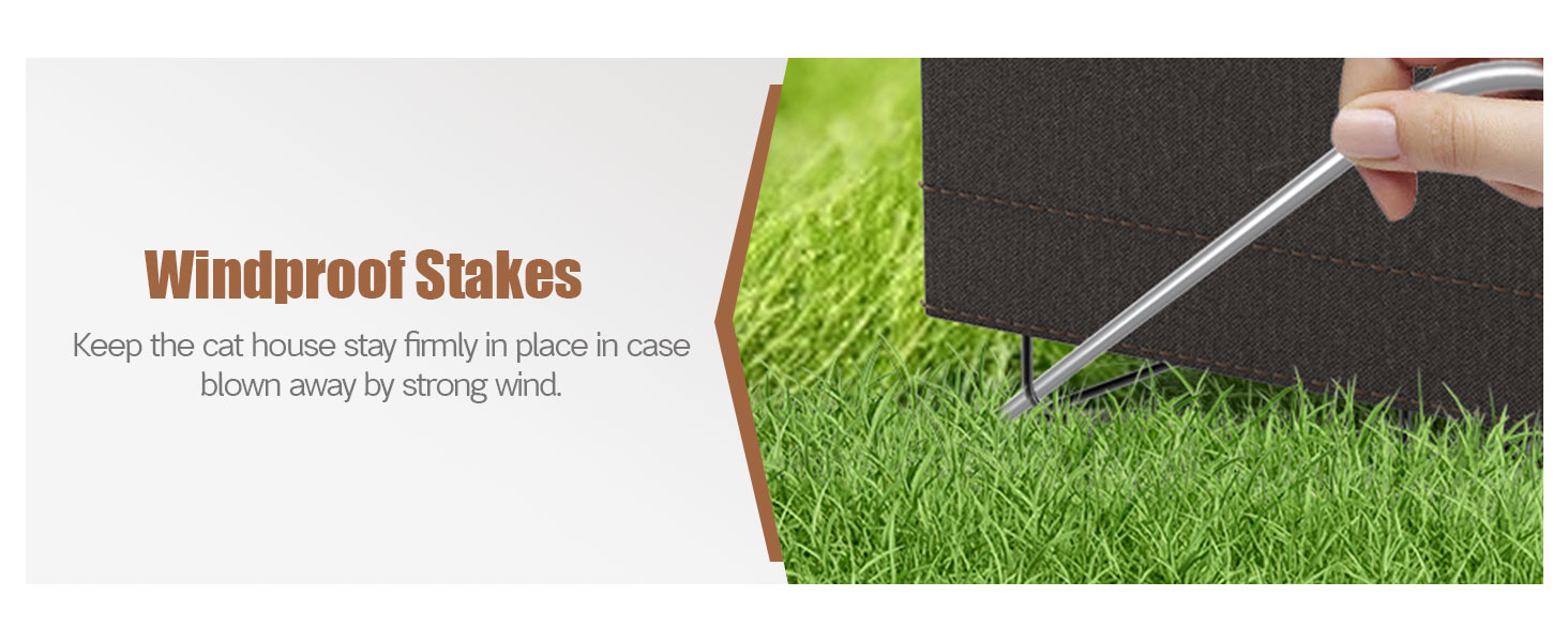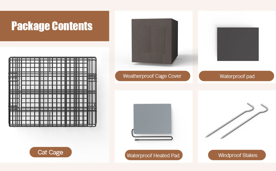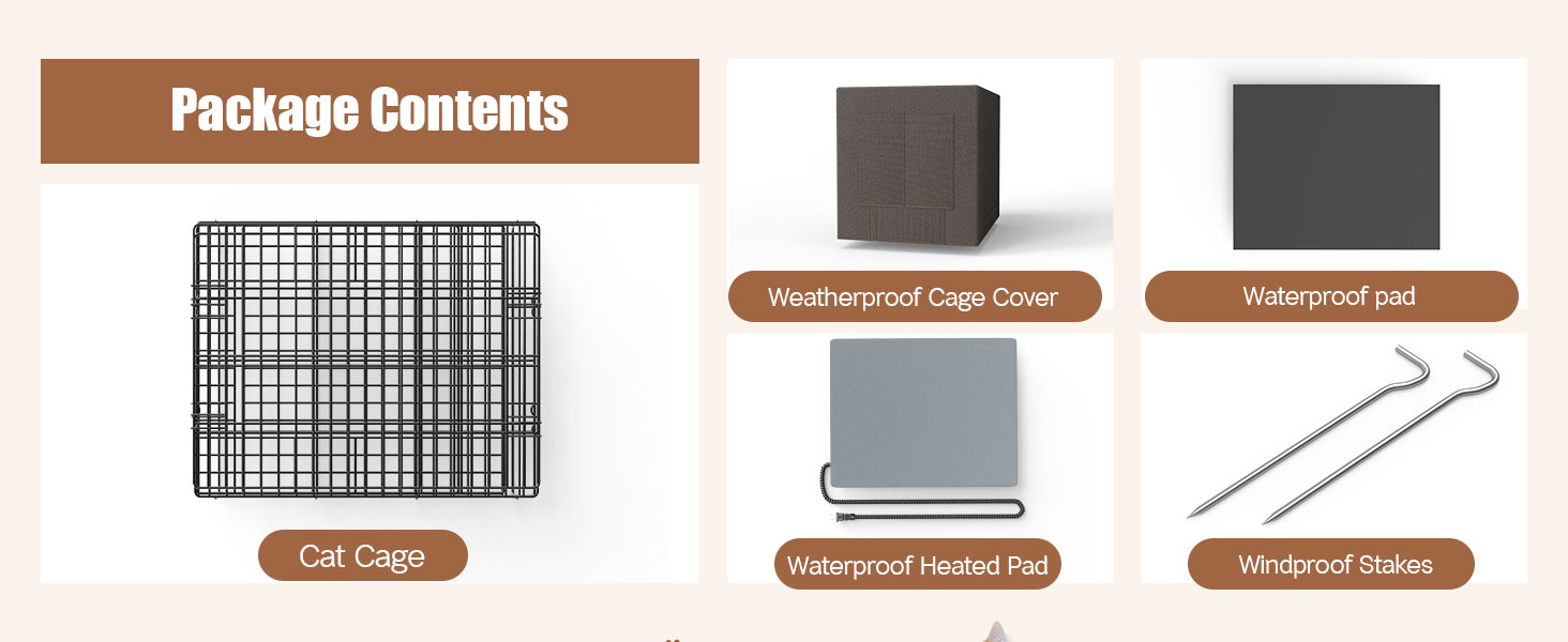 Package Includes: 1 sturdy metal cat house, 1 weatherproof cage cover, 1 heating pad, 1 bottom liner, and 2 stakes