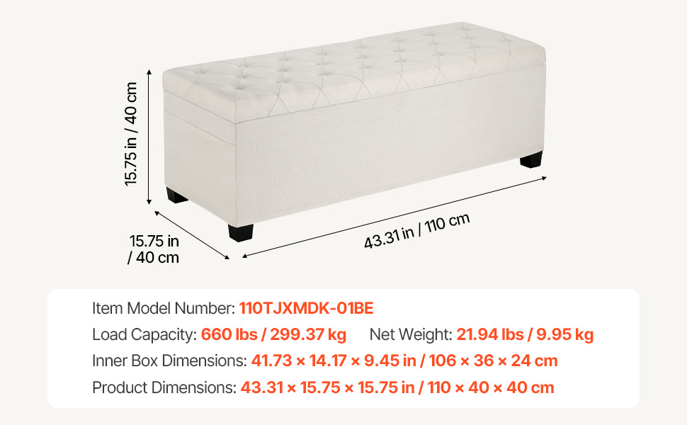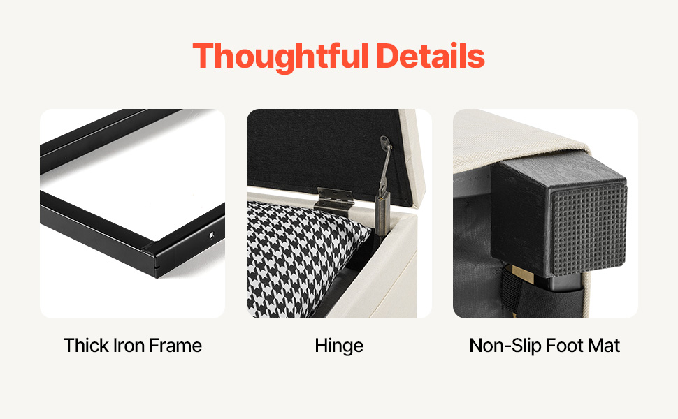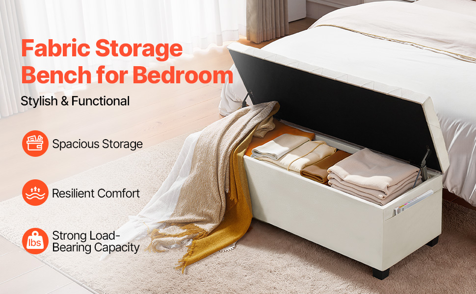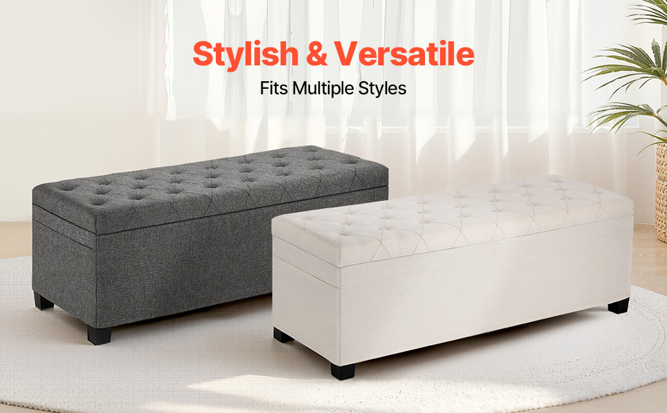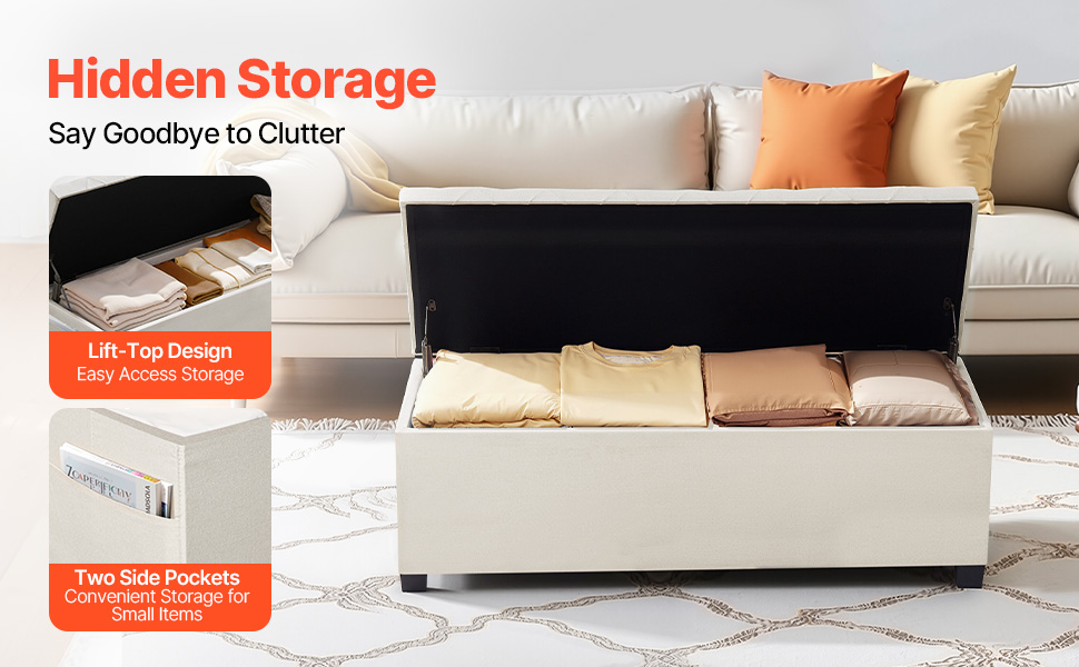 Progettata con un coperchio ribaltabile incernierato, la nostra panca contenitore offre ampio spazio interno per riporre biancheria da letto, libri o oggetti essenziali di uso quotidiano. Le sue due tasche laterali possono contenere piccoli oggetti come telecomandi o telefoni.