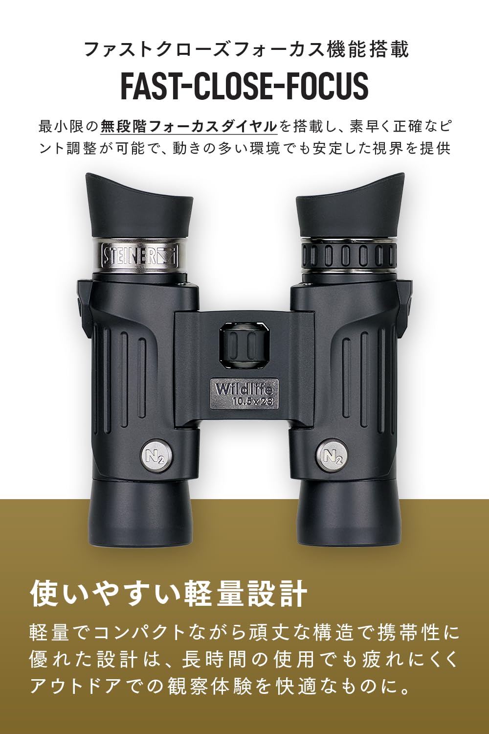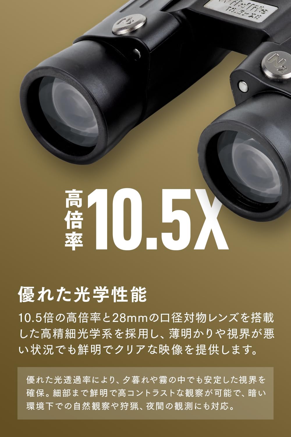 【Excellent Optical Performance】Wildlife 10.5x28 has a high-definition optical system that provides crisp and clear images even in dim light or poor visibility conditions. Excellent light transmittance ensures stable visibility even at dusk or in fog. It allows for clear, high-contrast observation of even the smallest details. Designed for nature observation in dark environments, hunting, and night observation, it provides a comfortable observation experience in any situation. It has performance that will satisfy everyone from beginners to experienced users. ■ [Comfortable field of view] The powerful 10.5x magnification allows you to clearly observe the details of nature and animals. The high-definition optical design maintains clarity throughout the field of view, making it ideal for detailed observations. The lightweight and highly portable design accommodates a wide range of users from beginners to professionals. Enrich your outdoor observation experiences such as bird watching and nature observation. ■[Lightweight design that is easy to use] The lightweight and compact design makes it easy to carry and suitable for even the most demanding hikes and mountain climbs. Equipped with a "Fast Close Focus" function, it enables quick and accurate focus adjustment and provides stable vision even in environments with a lot of movement. The highly portable design reduces fatigue even when used for long periods of time, making your outdoor viewing experience more comfortable. Its sturdy construction withstands harsh environments and delivers performance that meets the expectations of a wide range of users, from beginners to professionals. These binoculars are an ideal companion for mountain exploration, nature observation, and other active outdoor activities. ■[Excellent quality] These binoculars are durable enough to withstand even harsh environments. It is waterproof up to a depth of 3 meters and has an anti-fog design with nitrogen filling, providing clear visibility even