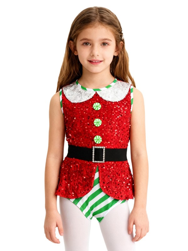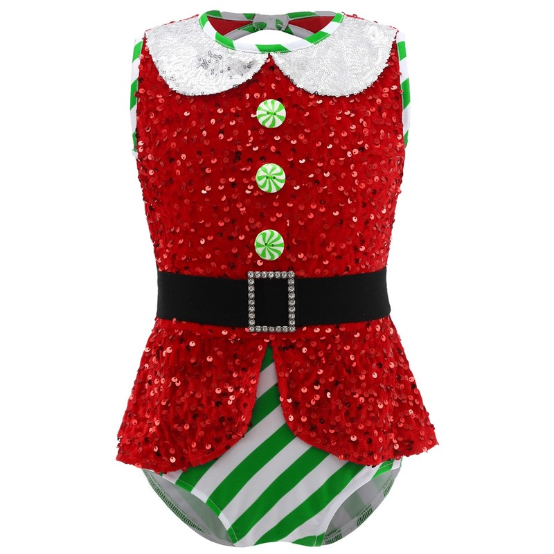 Kids Girls Christmas Elf Bodysuit Candy Buttons Back Cutout Jumpsuit/Waistbelt