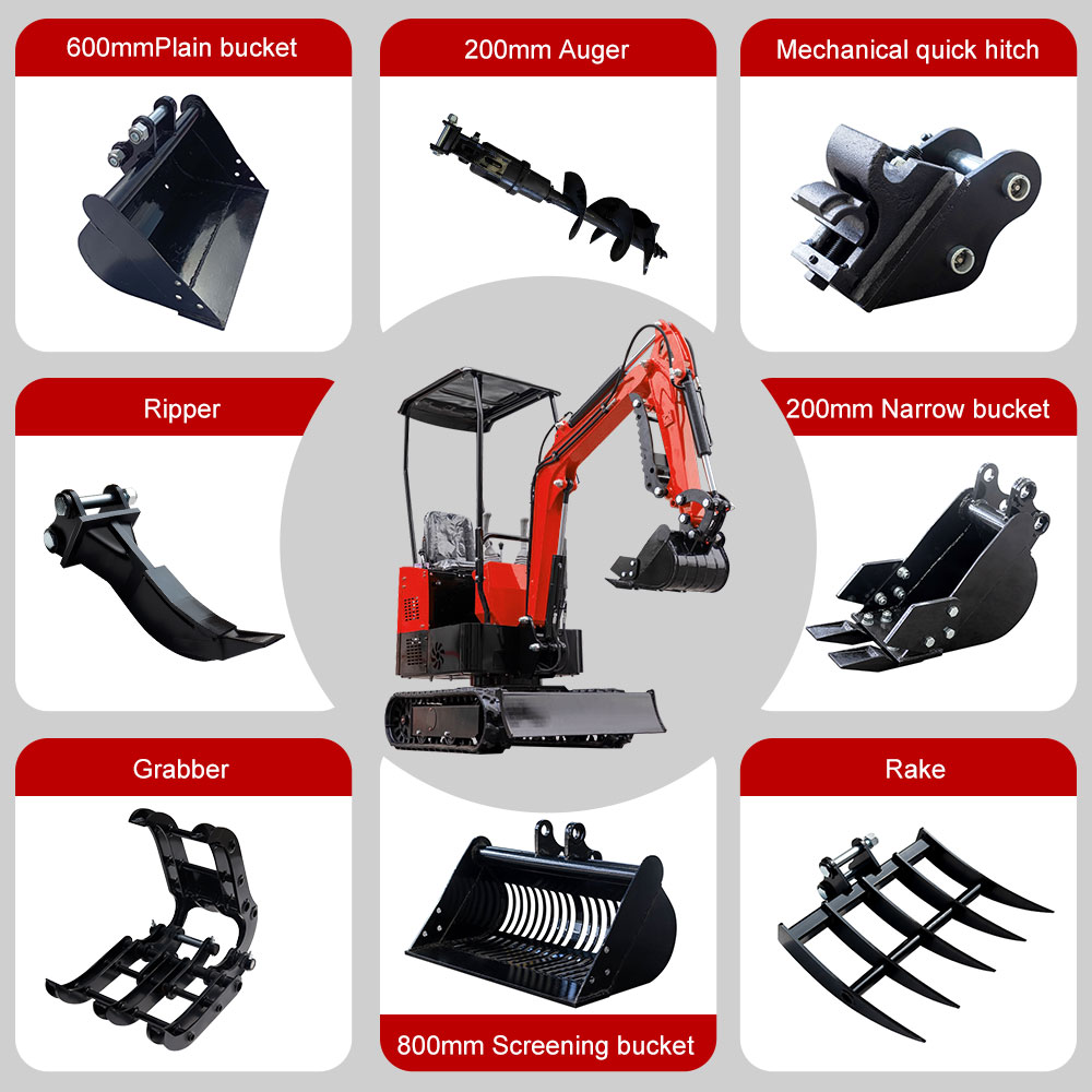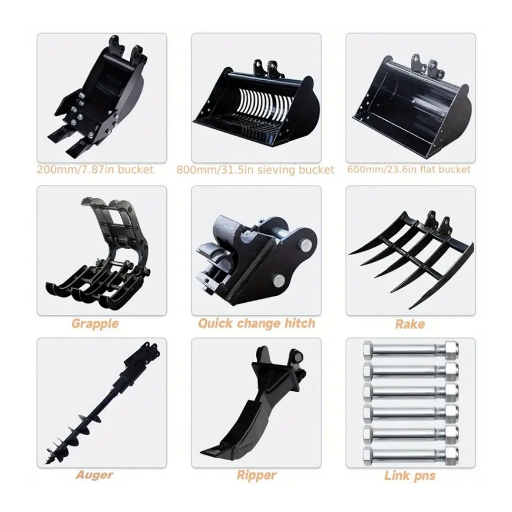 This attachment package is compatible with most mini excavators equipped with a standard quick attach (25mm pin-on) system.