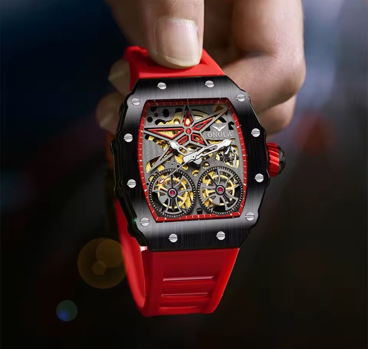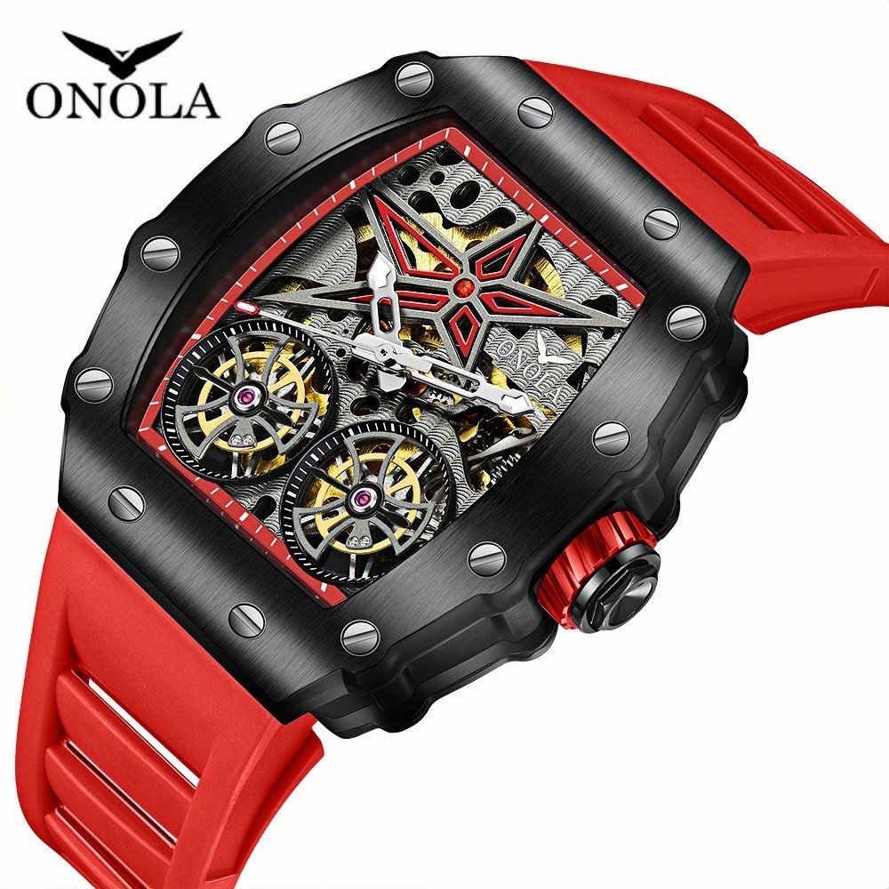 Elevate your style with this ONOLA men's automatic mechanical watch! Featuring a stunning tourbillon skeleton design, you can admire the intricate inner workings of the timepiece. The red rubber strap offers comfort and durability, perfect for everyday wear. With a 50M water resistance, it can handle splashes and brief immersions. The alloy case and mineral  glass mirror ensure sturdiness and clarity. Whether for work or leisure, this watch adds a touch of sophistication to any outfit.