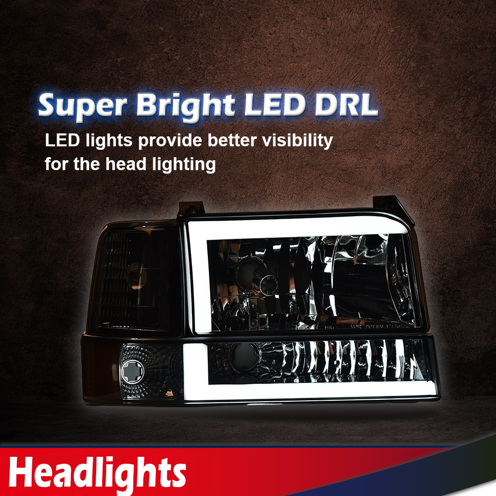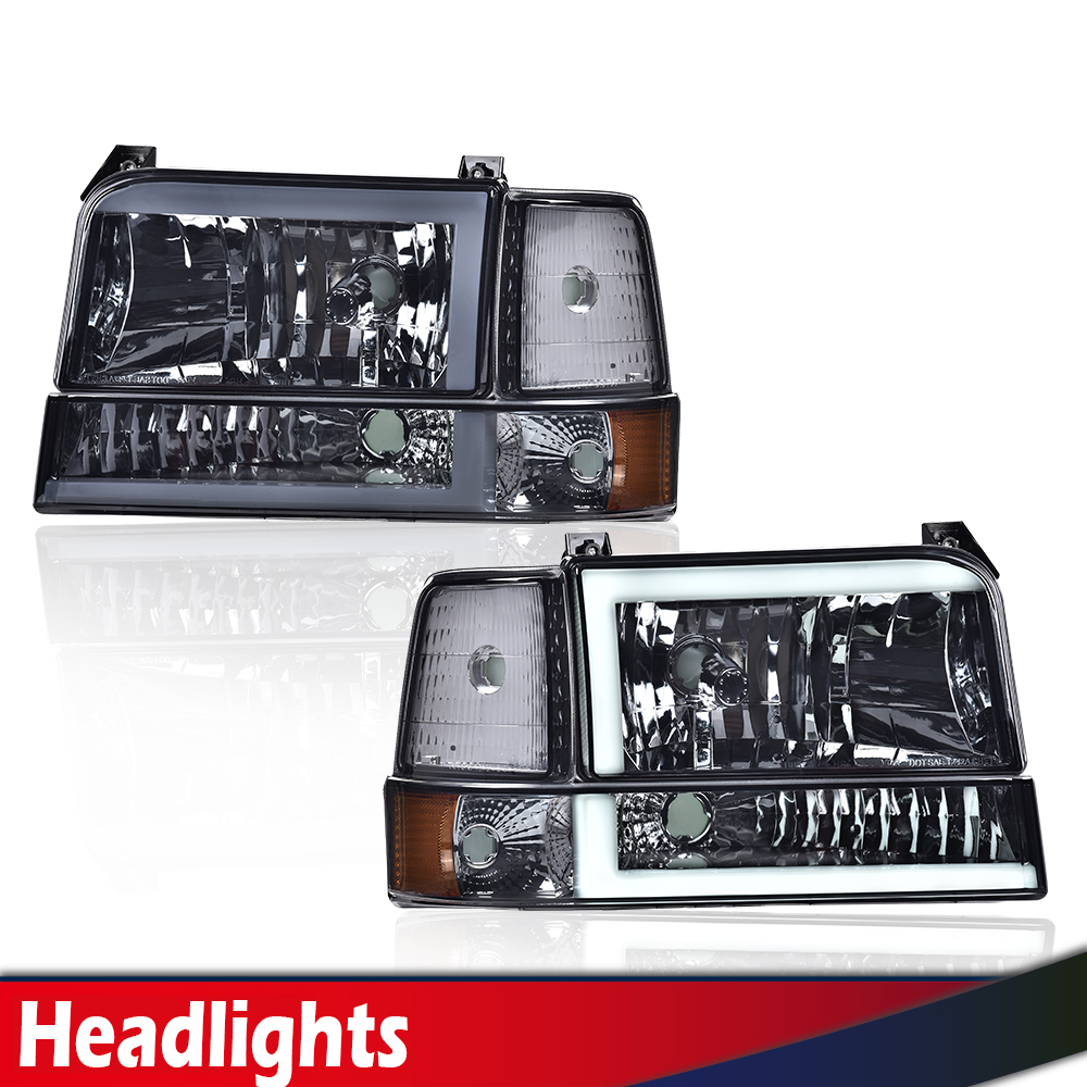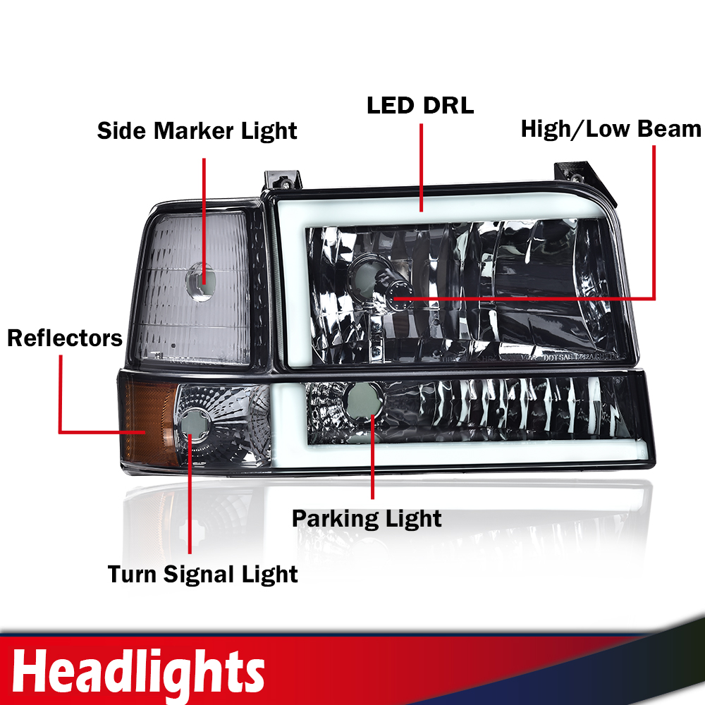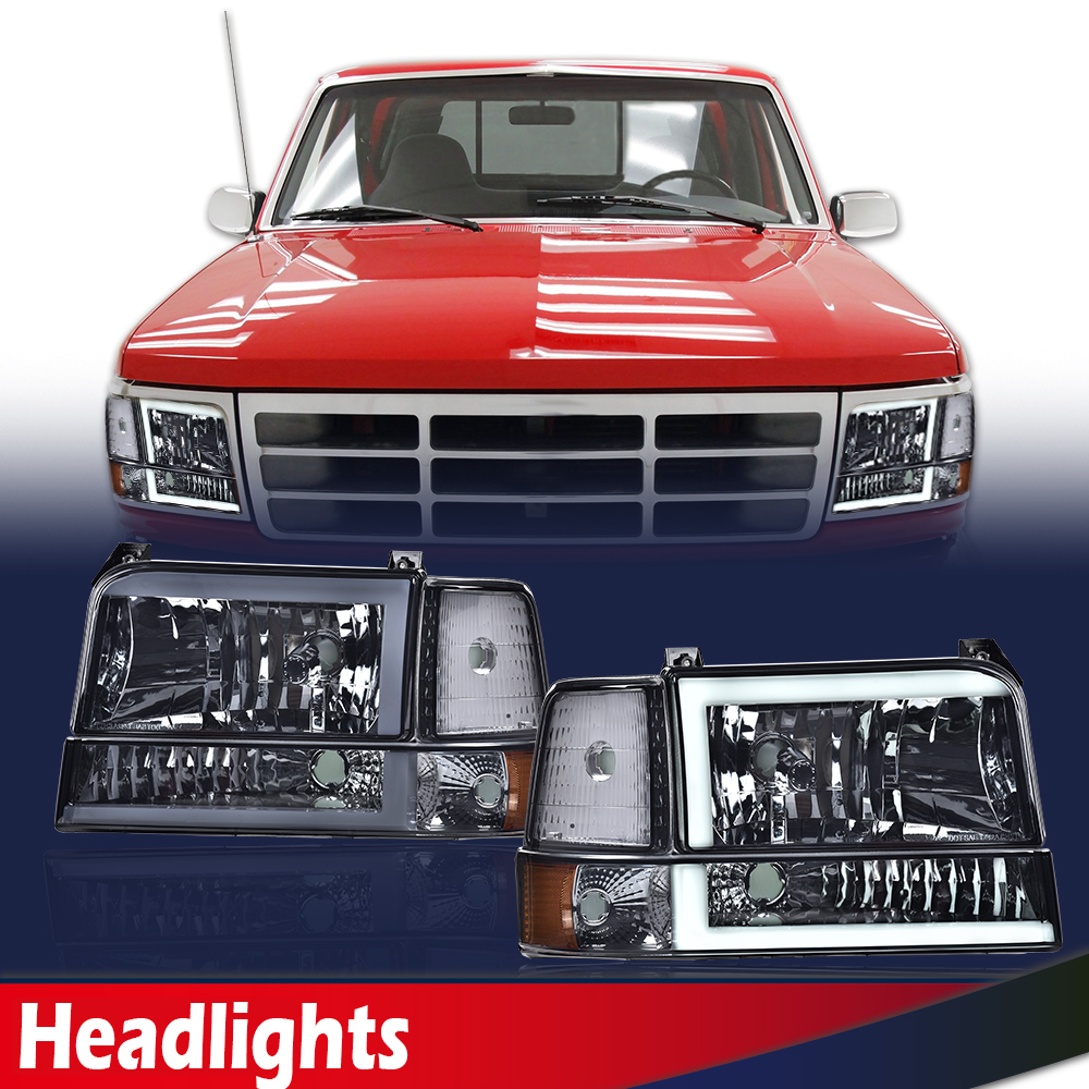 Fit For 1992-1996 Ford F150 F250 F350 Dual LED DRL Bumper Headlights 6PCS Chrome