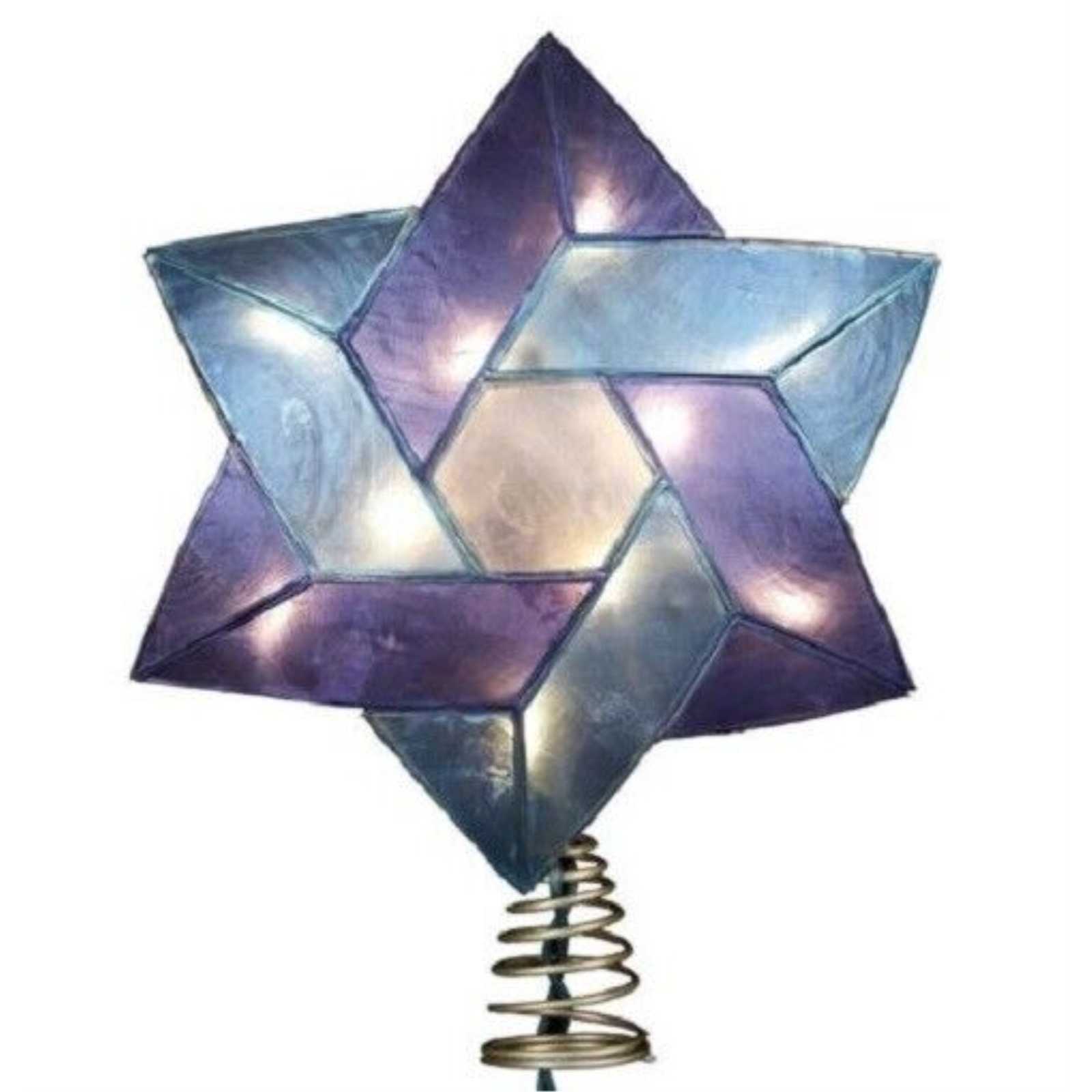 Star of David Tree Topper. Lights up. Approximately 36 inch (.9m) lead wire. 110V wiring (do not buy if your country has 220V electrical). Comes with 4 spare bulbs and 2 replacement fuses. Made from metal and acrylic. Star (without metal attachment) is approximately 7 inches across. Single sided treetopper. Includes original manufacturers box and packaging. Made by Kurt Adler. For indoor use only.