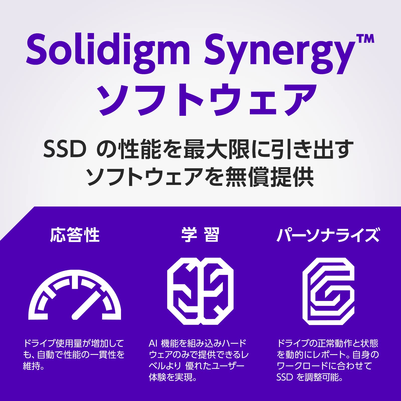 M. 2280 SSD products for consumers ■ M.2 2280 Form Factor SSD that supports PCIe 4.0 interface ■ Up to 4,125MB/s high -speed loading performance ■ High level of PC users from everyday use to gaming. Achieves balance between performance and price. ■ By utilizing "SOLIDIGM SYNERGY", it is possible to enhance the caching function of drive operation monitoring and host control as an optional function.