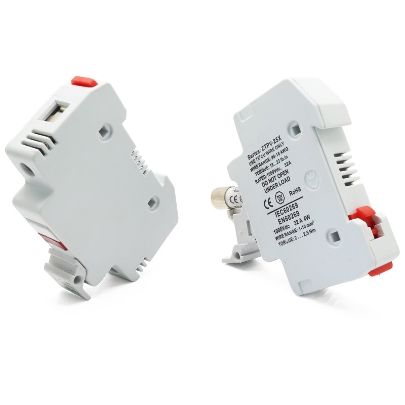 This bracket is suitable for 12A, 15A, 20A, 25A and 30A, 32A PV fusible. The maximum voltage is 1000V. The fusible holder can be combined with the following PV string fusible, which are essential for protection for solar panels. -1000V DC-20B - 45mm Modular Cutout - 1 Module (17.5mm) X Post - 35mm DIN Rail Mount - High Temperature Plastic - High Insulation Properties