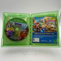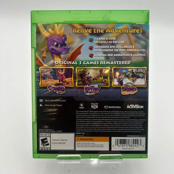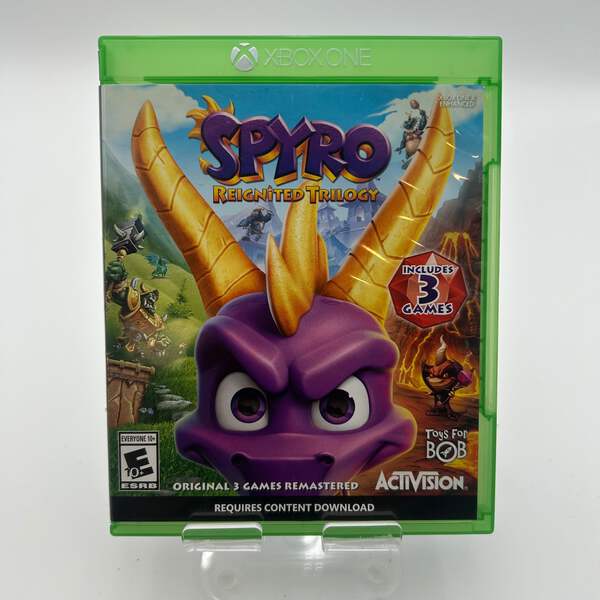 **Recommended Title**: Xbox One Spyro Reignited Trilogy Uséd with Box**Item Description**: Are you ready to relive the magic of Spyro? Enjoy the classic adventure game with the Xbox One version of Spyro Reignited Trilogy. This beloved title includes remastered versions of the original Spyro games, featuring vibrant graphics and updated mechanics to provide a nostalgic yet fresh experience. Perfect for both new and seasoned players, this game will take you back to the Dragon Kingdom with all the excitement and charm you remember.This game has been tested and confirmed to work perfectly. The disc does show some light scratches, which are minor and do not affect its functionality. The case includes inserts and is also in good condition but has some light scratches that are barely noticeable. With its engaging gameplay and iconic characters, Spyro Reignited Trilogy is a fantastic addition to any Xbox One library, ideal for hours of fun whether you're in for a solo adventure or a family gaming night.