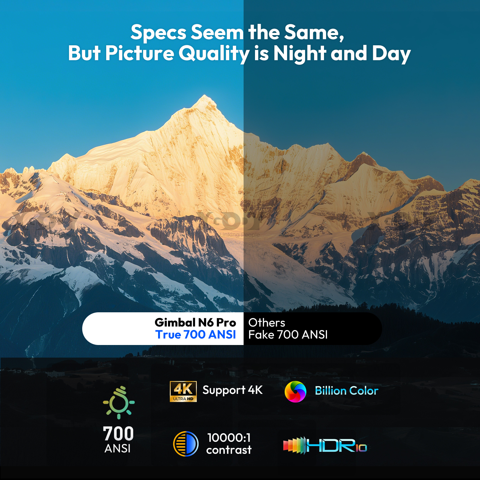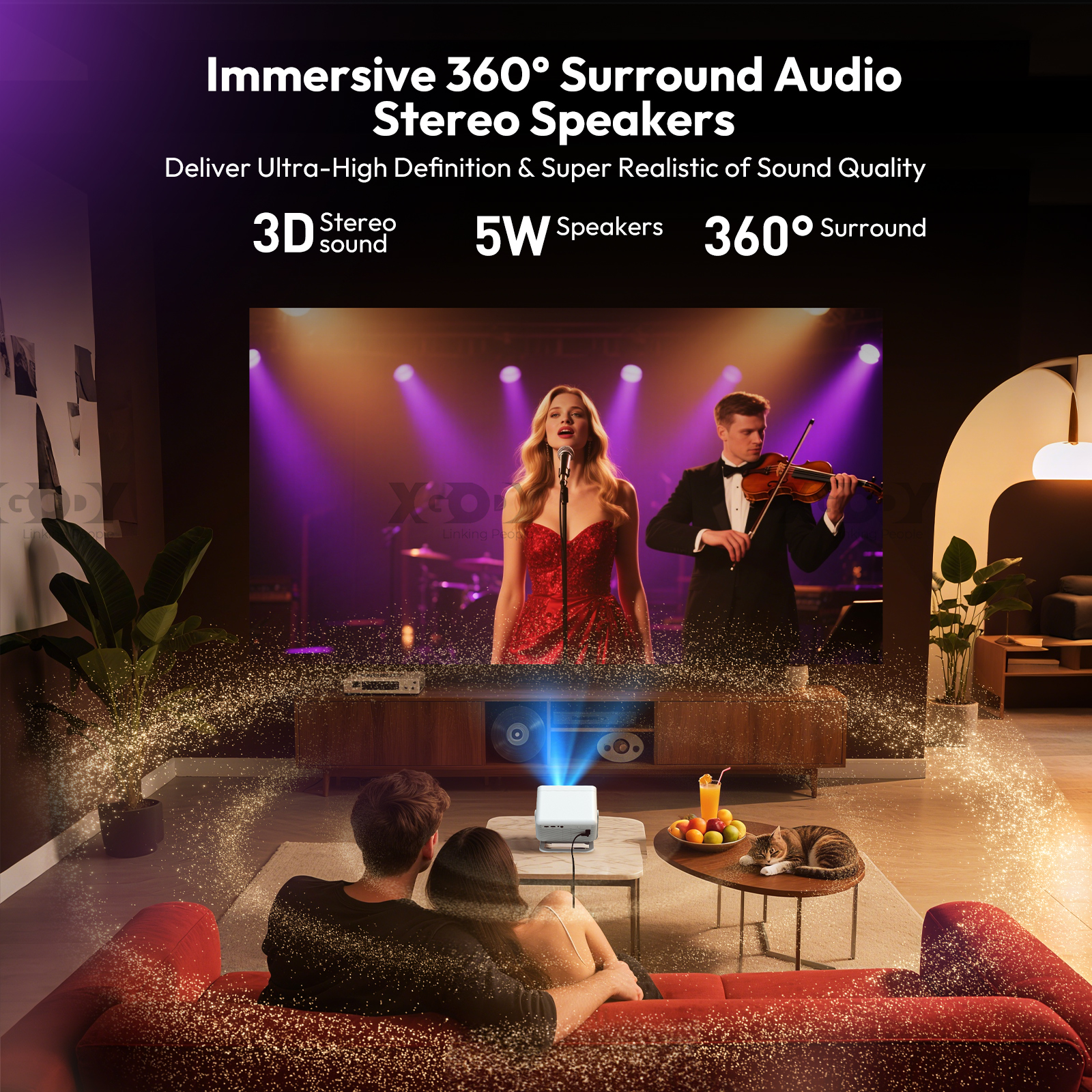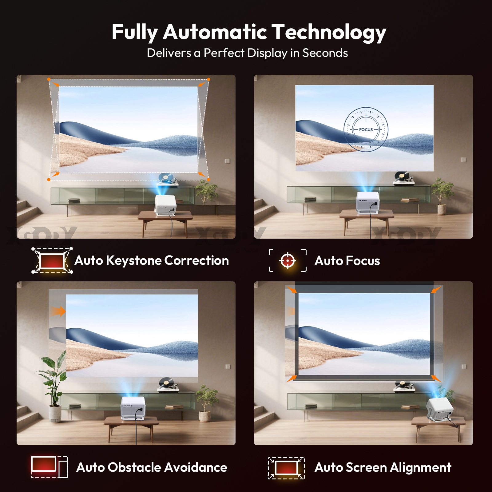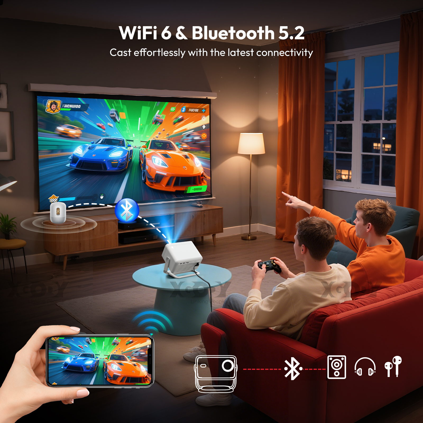 【Autofokus & Google Assistant 】This smart 4K projector can adjust focus automatically or electronically via the remote control. Google Assistant also makes searching easier. Just press the button and say what you want to search for. Enjoy a convenient life with the XGODY outdoor movie projector.【Say goodbye to dark screens | 700 ANSI | 4K Support】This latest mini projector from 2025 features a native Full HD resolution of 1080p and a brightness of 700 ANSI lumens. The 4K TV projector displays over 50% more details more vividly than other projectors with 1080p support, and 4K support takes video quality to a new level. Experience a vivid and immersive visual experience.