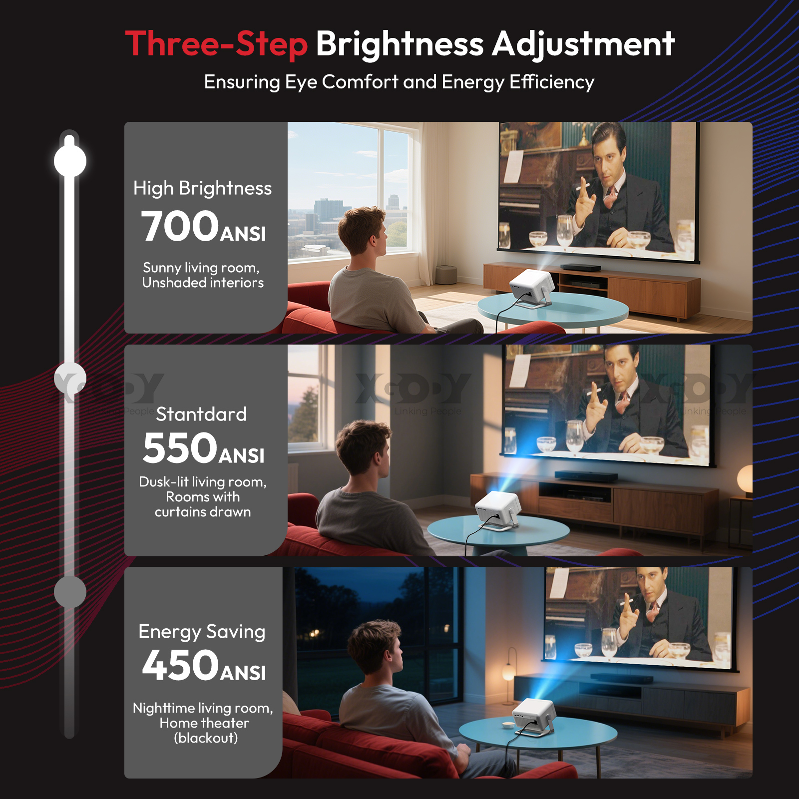 【Three Brightness Adjustment Modes】The XGODY N6 Pro smart projector features three brightness adjustment modes: Energy Saving Mode, Standard Mode, and High Brightness Mode. The brightness of Energy Saving Mode is more suitable for watching movies in dark environments, while High Brightness Mode is better suited for watching movies indoors in natural light. You can adjust the applicable mode yourself in different brightness environments.