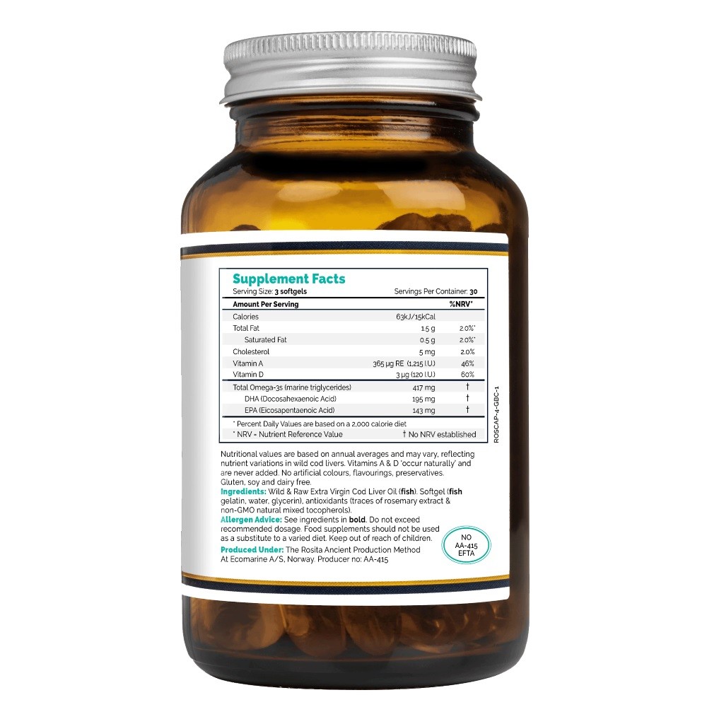 Rosita Premium Extra Virgin CodLiver Oil (EVCLO) is fresh and raw codliver oil, made from wild cod. Straight from the crystalline Norwegian seas, it contains naturally occurring vitamins A and D, as well as the full spectrum of omega fatty acids, including omega-3: EPA and DHA. A dietary supplement in convenient-to-swallow capsules.