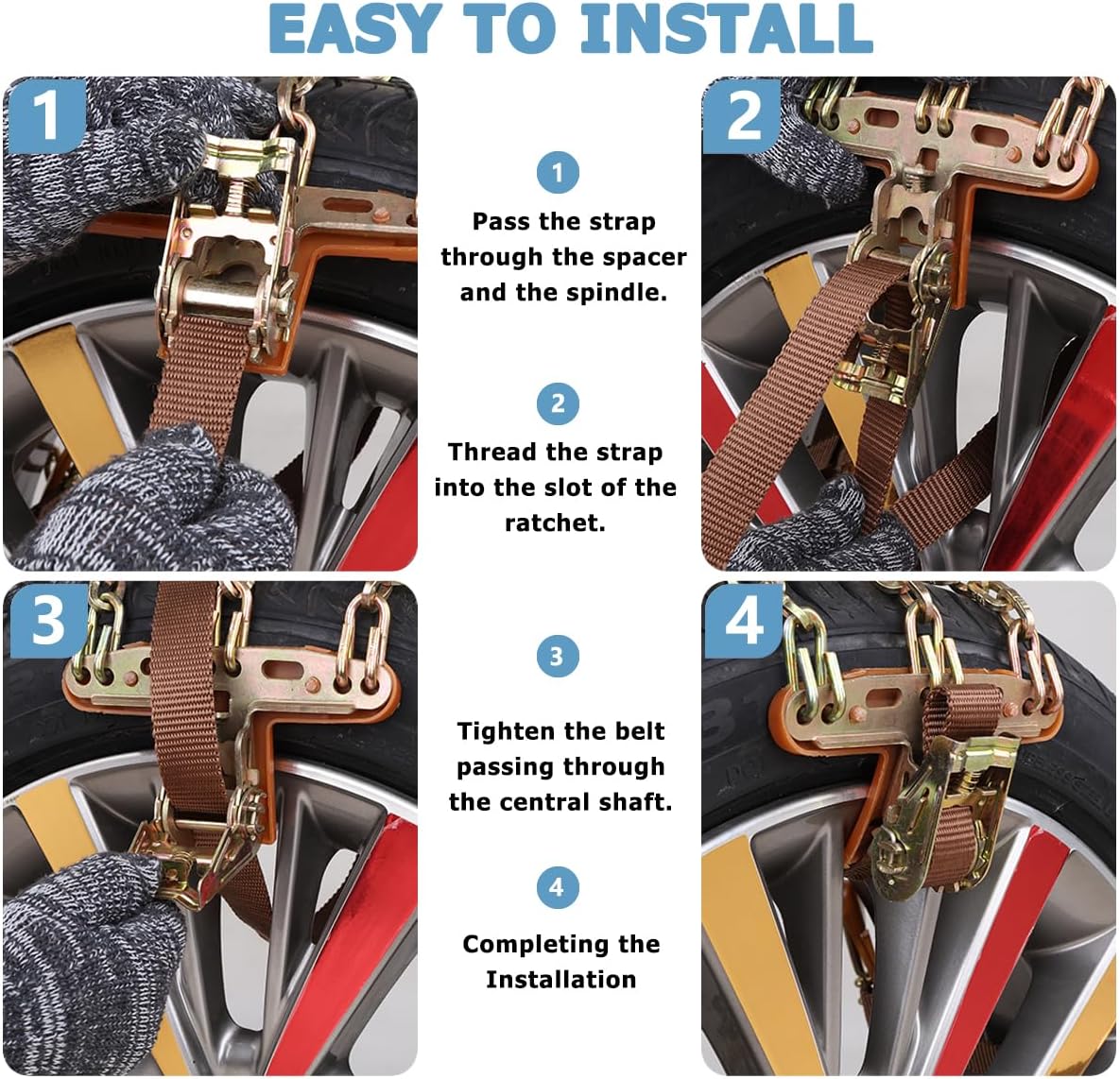 [Upgrade the automatic fastener for easy installation] : Install the car snow chain, remove the tire, and move the vehicle without using any tools.