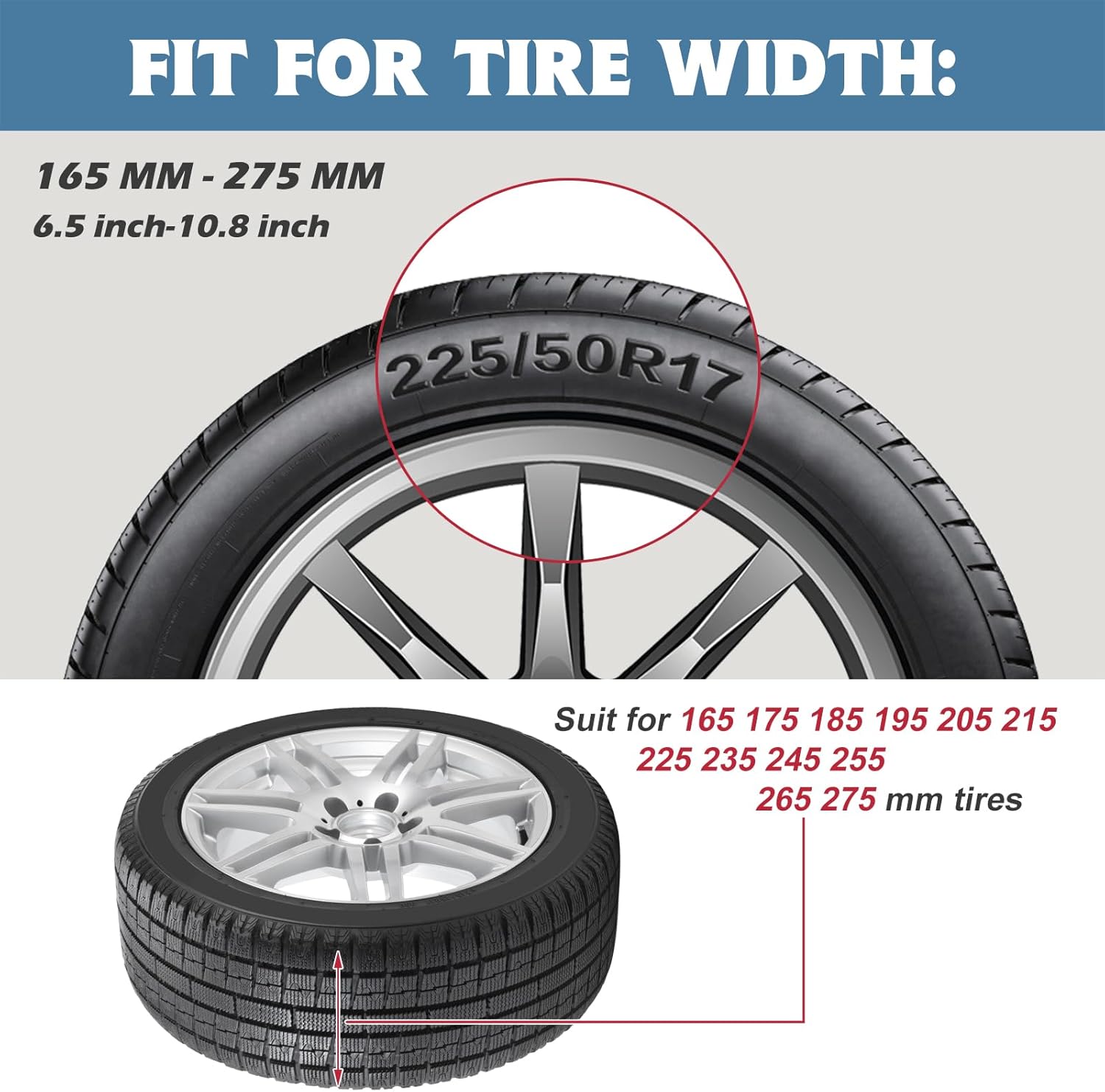 For Tire Width: about 16.5 - 28.5cm/6.5 - 11.2in
