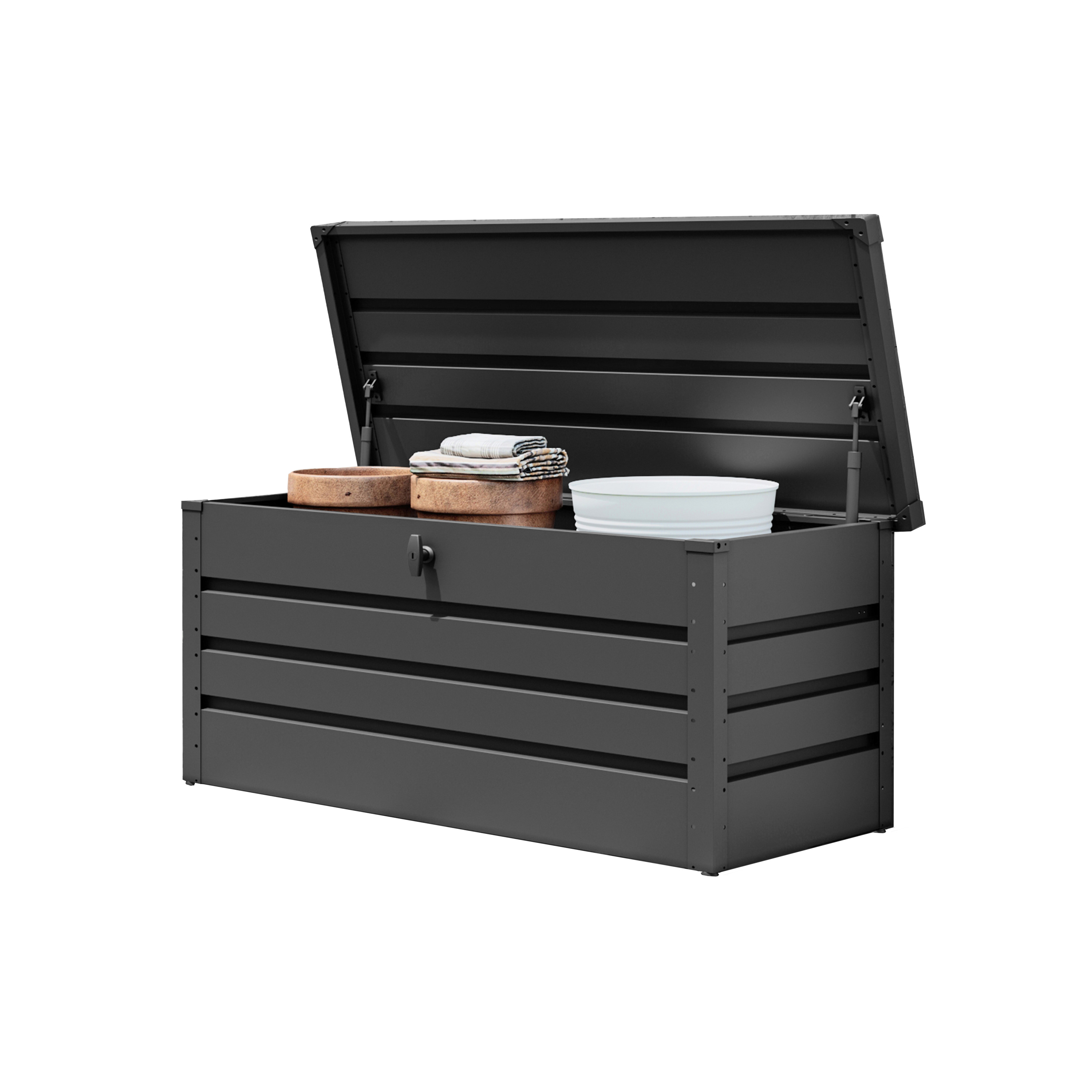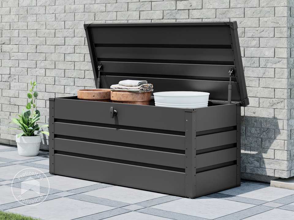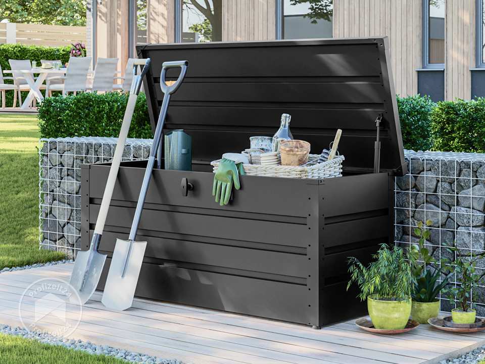 In der wetterfesten und geräumigen Gartenbox Brian der Qualitätsmarke PRIMEYARD lassen sich zahlreiche Outdoor-Utensilien geschützt unterbringen. Klar und schlicht in der Form, stark und zuverlässig in der Leistung!