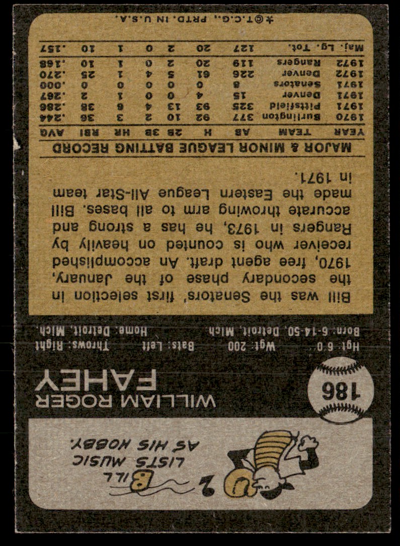 | 1973 Topps Bill Fahey EX Set Break #186 |