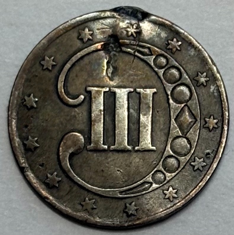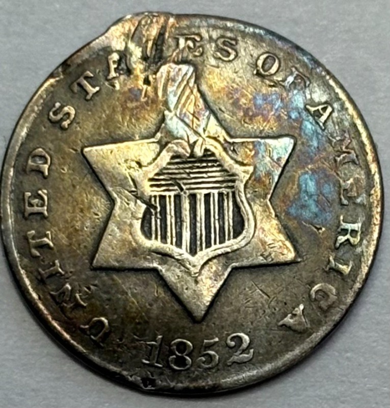 SHOWN HERE FOR YOUR CONSIDERATION IS A 1852 SILVER THREE CENT PIECE VERY FINE CONDITION WITH RIM DINGS, SLIGHT BENT AND ENVIRNMENTAL DAMAGES. COMES AS SHOWN.