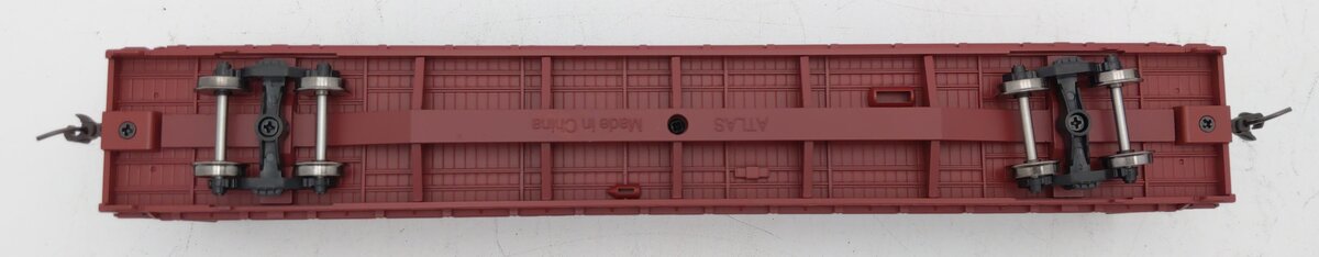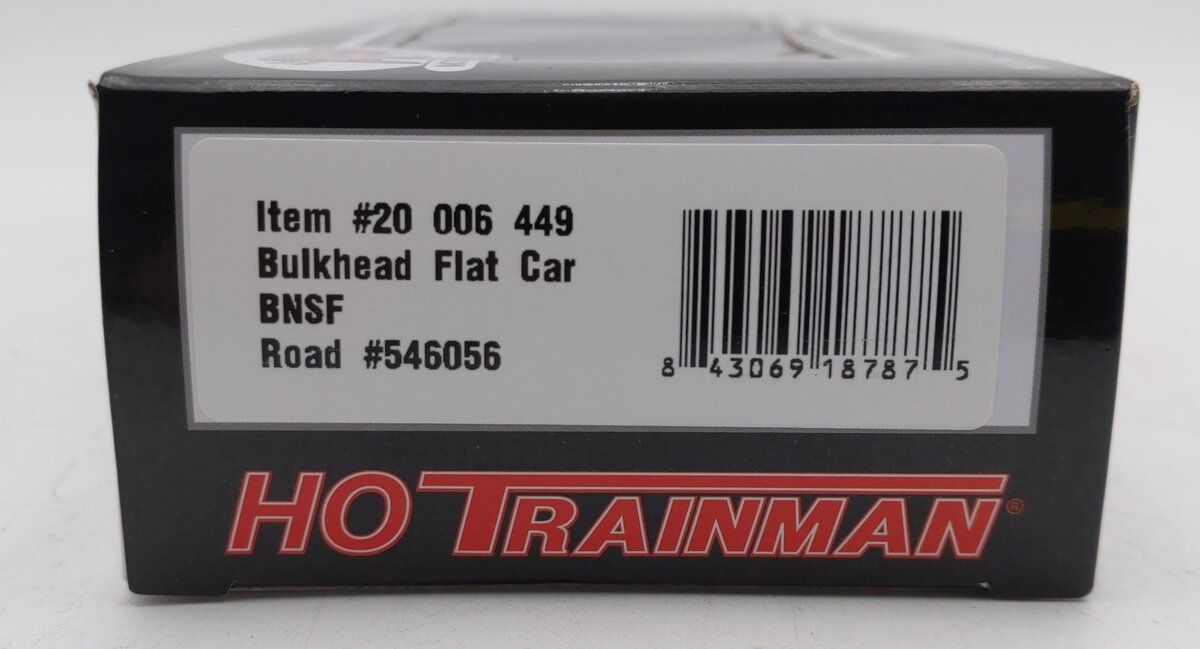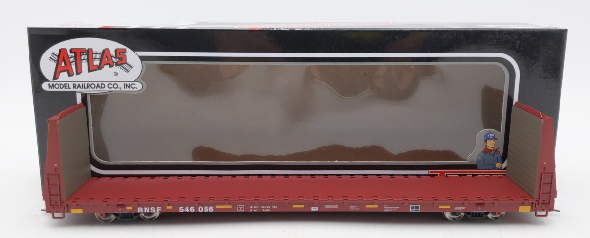 This is an Atlas 20006449 HO BNSF Bulkhead Flat Car #546056. Features: Side stake pockets. Simulated tie-loops. Fishbelly center-sill. Prototypical pull-plates and lift rings. Realistic pipe load with separately applied load tie-downs (2016 Run). AccuMate® couplers are made under license from AccuRail, Inc.