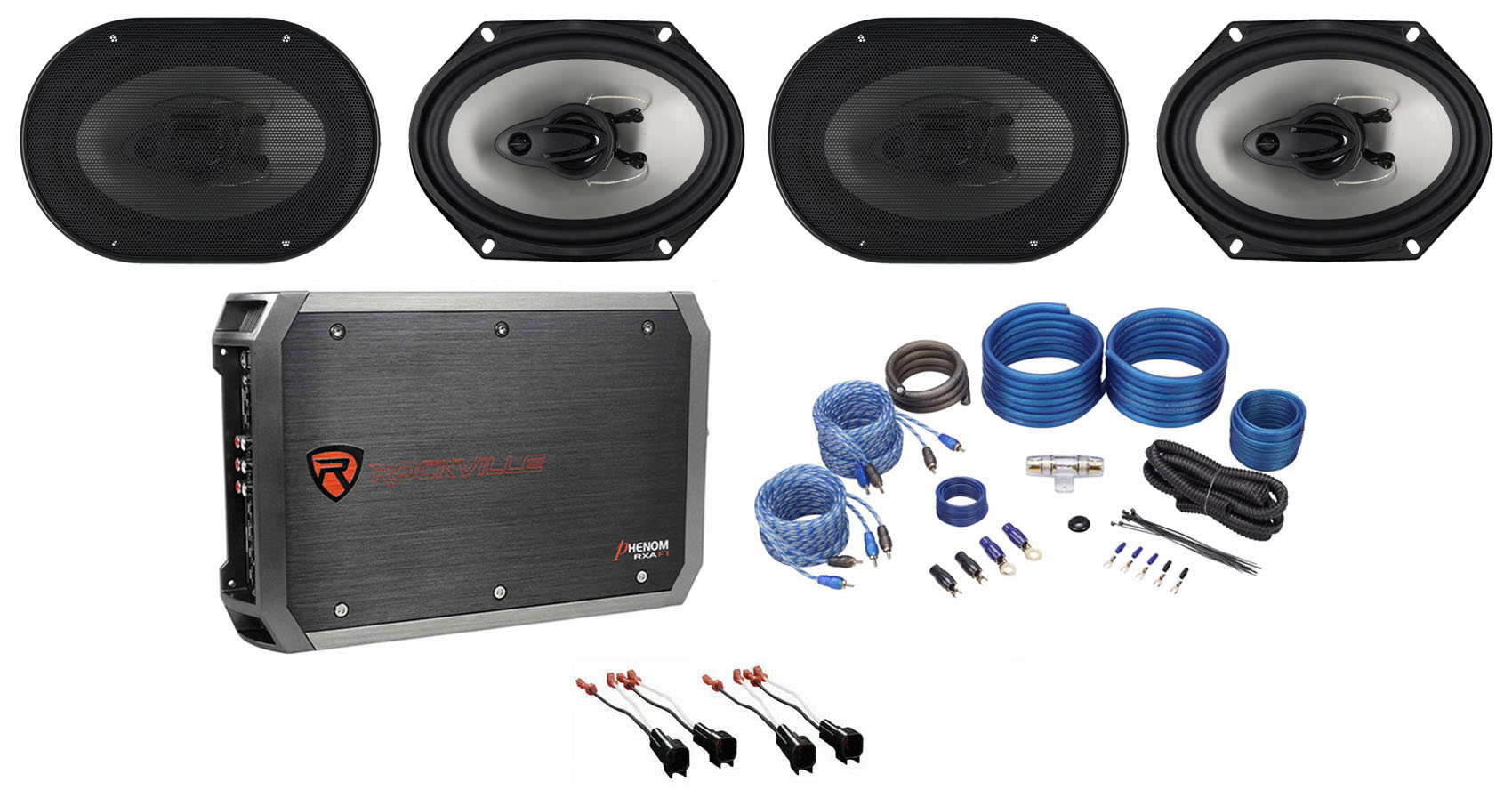Package: (2) Pairs of Rockville RV68.3A 6x8" 3-Way Car Speakers Rated 1800 Watts Peak and 340 Watts RMS +METRA 72-5512 Ford 1987-Up Speaker Wire Harness Connector + Rockville RXA-F1 1600 Watt Peak/400w Dyno-Certified RMS 4 Channel Amplifier Car Stereo Amp + Rockville RWK42 4 Gauge 4 Channel Complete Car Amplifier Installation Kit With (2) Sets of 100% Pure Copper RCA Cables