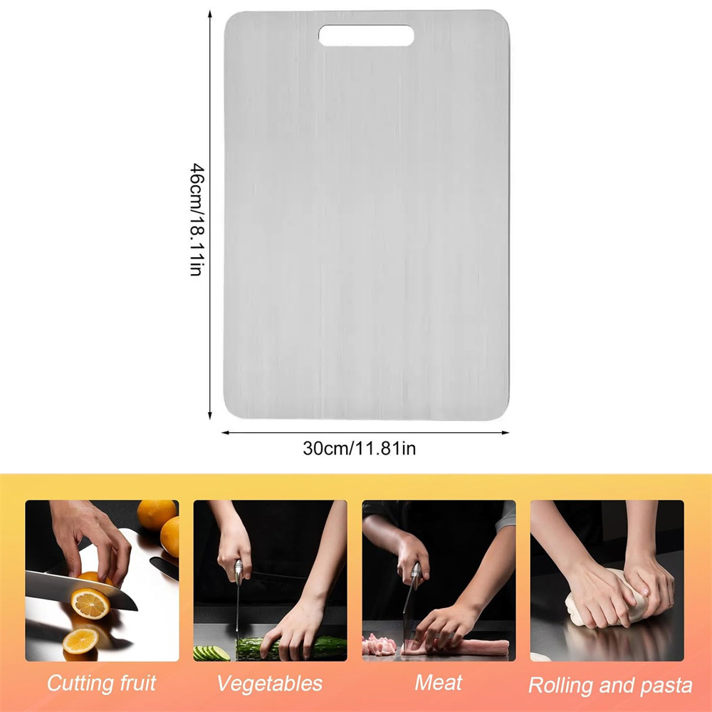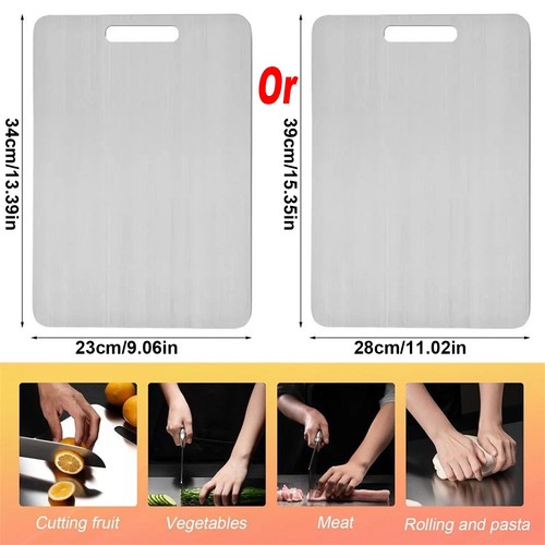 [LARGE SIZE] Our stainless steel chopping board measures 34*23cm/13.39in*9.06in Or 39*28cm/15.35in*11.02in, providing plenty of space for all your cutting needs. Both sides can be used, the front side for cutting fruits and vegetables and the back side for cutting meat to avoid cross use.