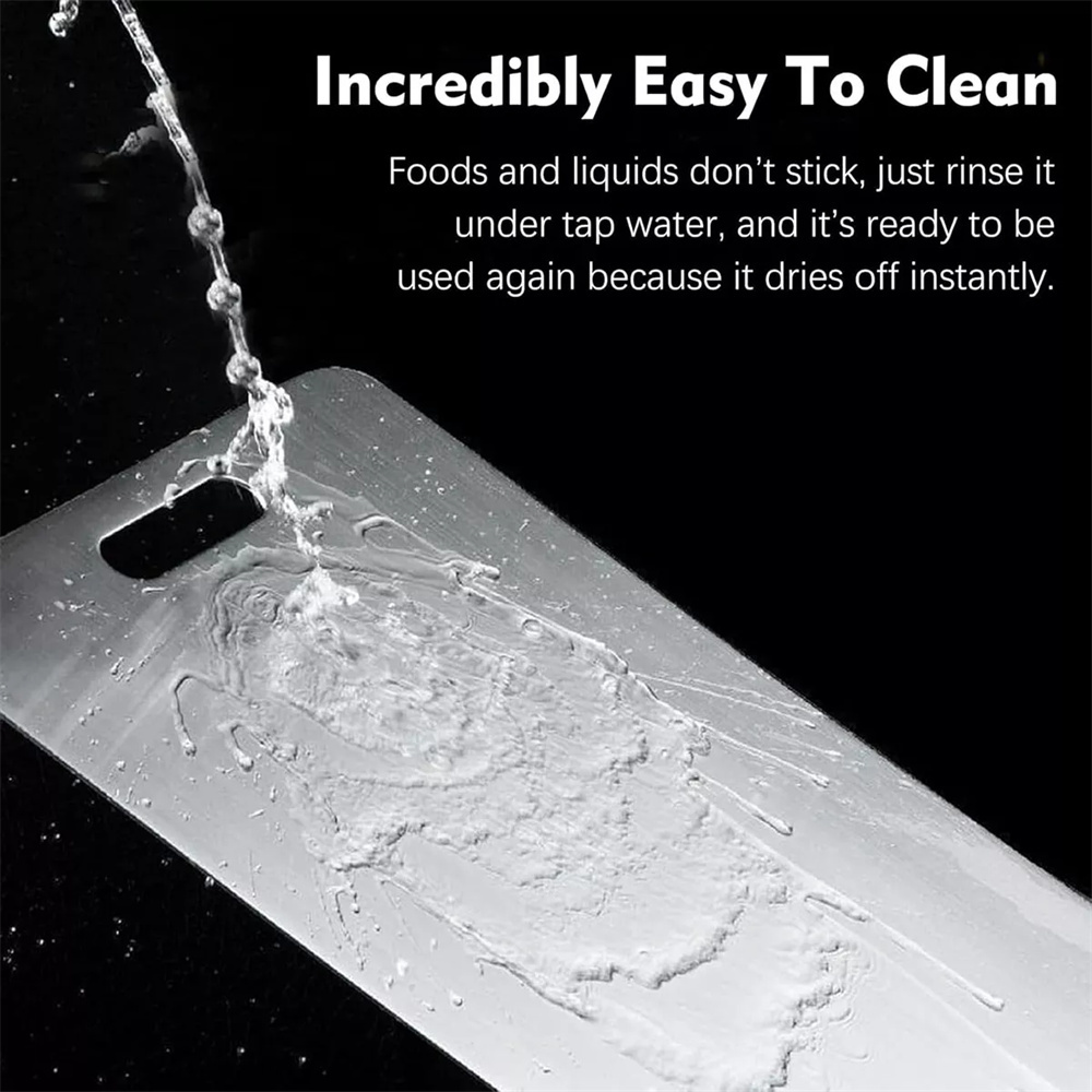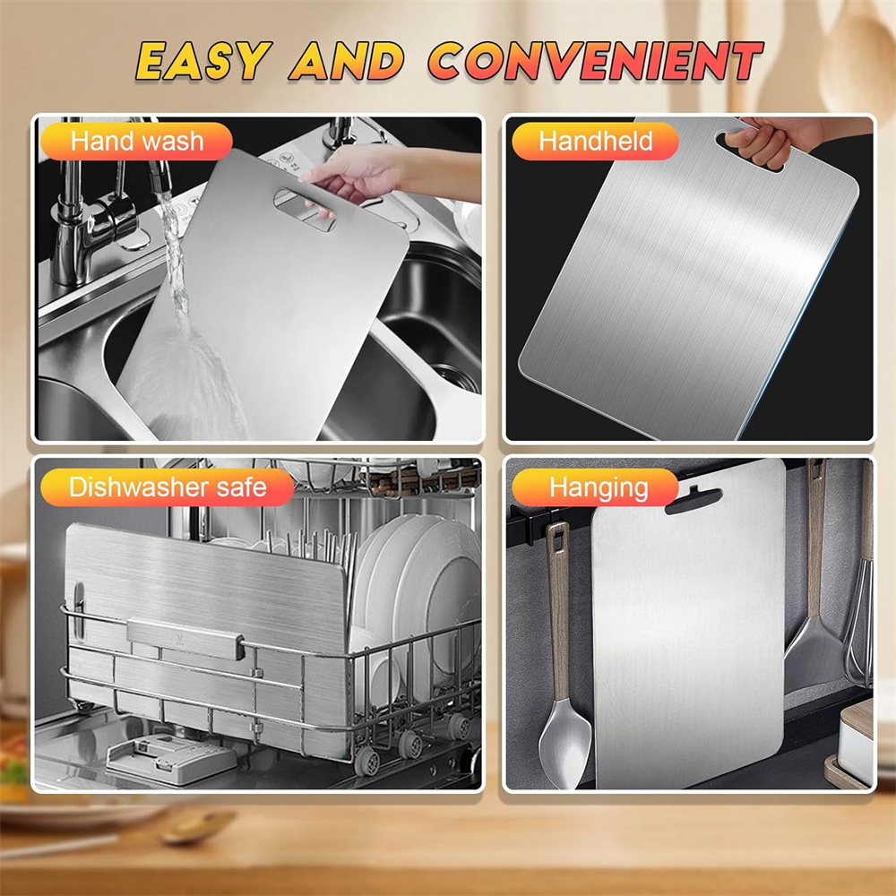 [Improve Efficiency and Portability] This stainless steel chopping board is easy to clean. Simply wipe it down with water and it's ready for the next use. Its lightweight design makes it easy to carry and its sturdy construction ensures that it won't deform or break easily.