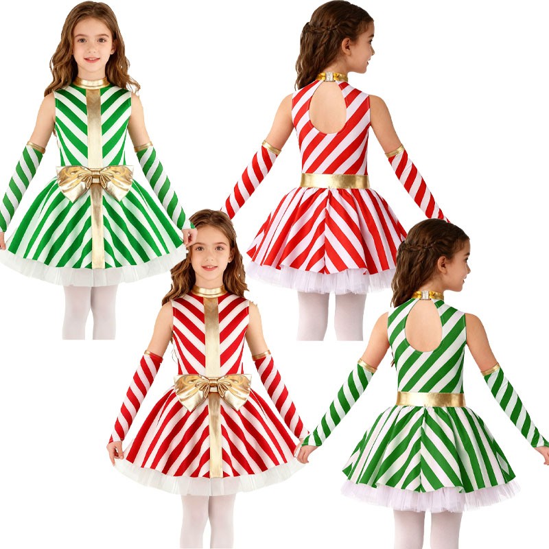 Kids Girls Dress Charming Dancewear Bowknot Costumes Attire Stripe Joyful Cute
