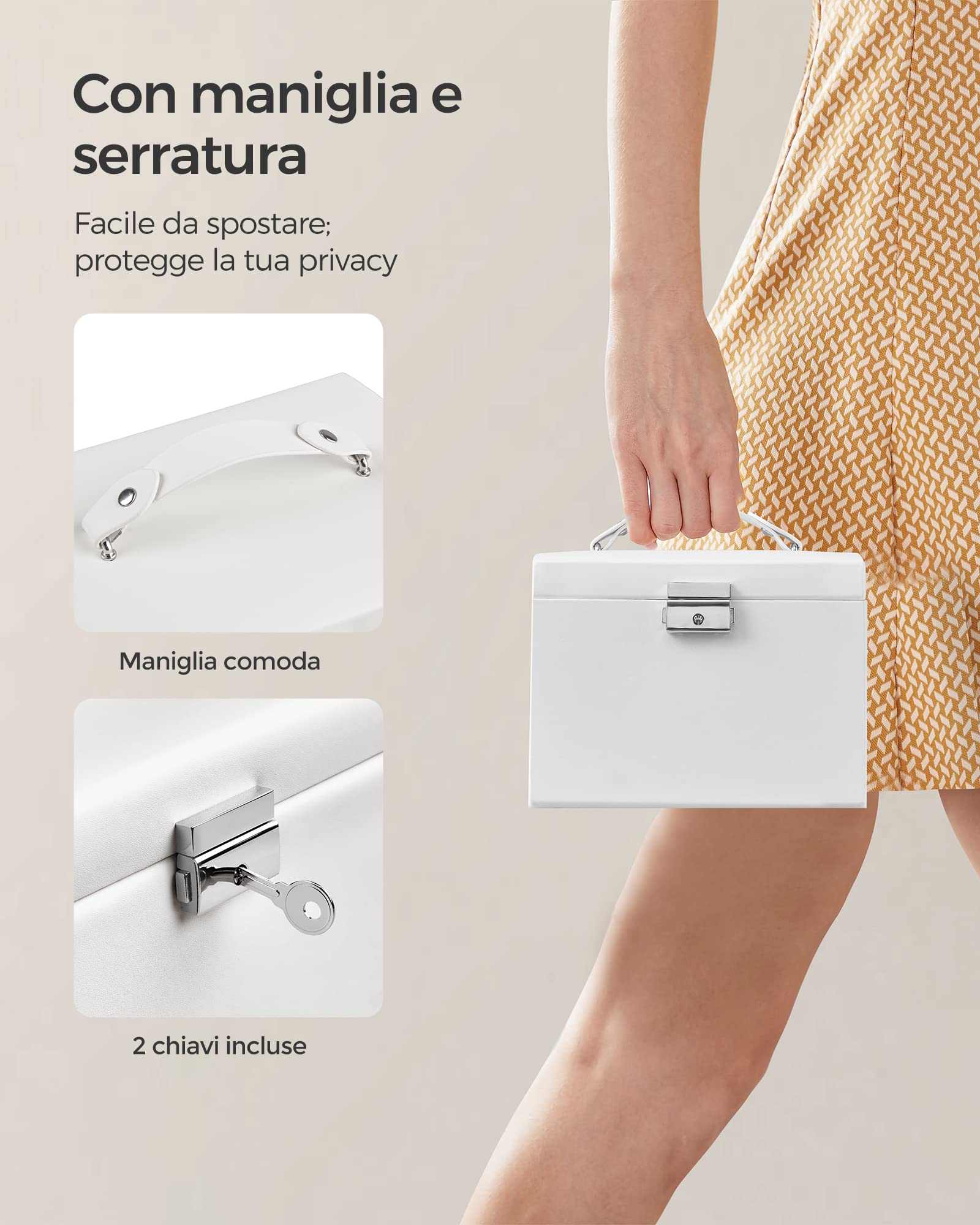 [Bloccabile e portatile] Questo portagioie è dotato di 1 serratura e 2 chiavi per proteggere i tuoi tesori da mani indiscrete. Grazie alla maniglia nella parte superiore, il portagioie può essere spostato facilmente ed è adatto per i viaggi