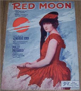 Red Moon As Introduced by Genevieve Tobin in the Comedy Polly Preferred at the John Golden Little Theatre, New York. Music by Henri de Martini and Max Kortlander and Lyric by Lew Brown and John Traver. 1922 Shapiro, Bernstein. Sheet music is in good condition, wear at edges, small tear at spine, wear at spine