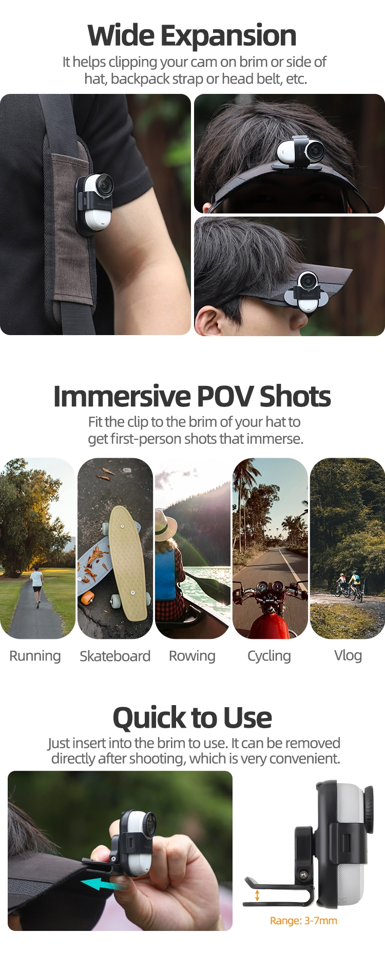 - Immersive POV Shots. Fit the clip to the brim of your hat to get first-person shots that immerse.
