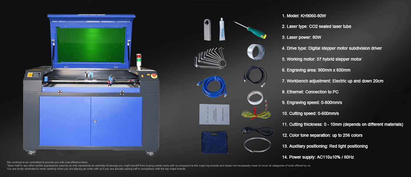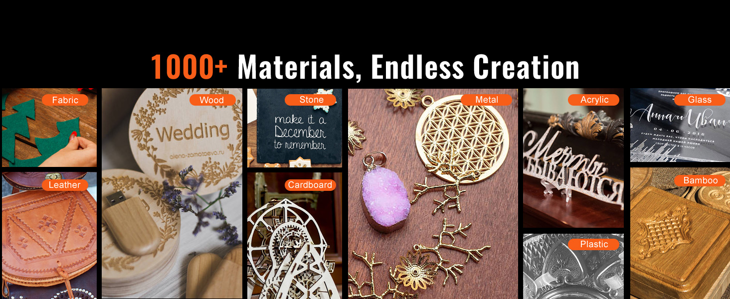 80W CO₂ Laser Engraver: Begin your journey into the world of laser engraving today with our 80W CO₂ laser engraver and cutter, and bring your ideas to life with extreme speed and precision. It can cut materials up to 10 mm thick in a single pass and engrave a wide range of materials such as wood, acrylic, cardboard, glass, leather, stone, and over 1000 other materials at speeds of up to 500 mm/s. What will you design first? (Laser class II, powerful 80 W DC)
