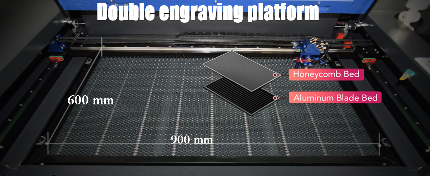 The work area has two platforms: The honeycomb cutting platform provides stability, noise reduction, and heat resistance for smaller items. The aluminum knife cutting platform offers adjustable height and intense rigidity for larger items such as acrylic blocks.