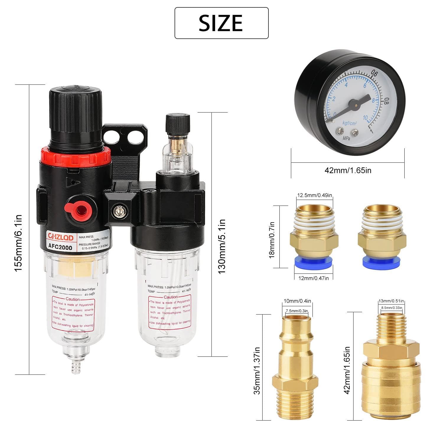 - Il regolatore dell'aria compressa รจ un'efficiente unitร di manutenzione con filtro e separatore d'acqua, attacco filettato femmina da 1/4 di pollice per il collegamento del compressore