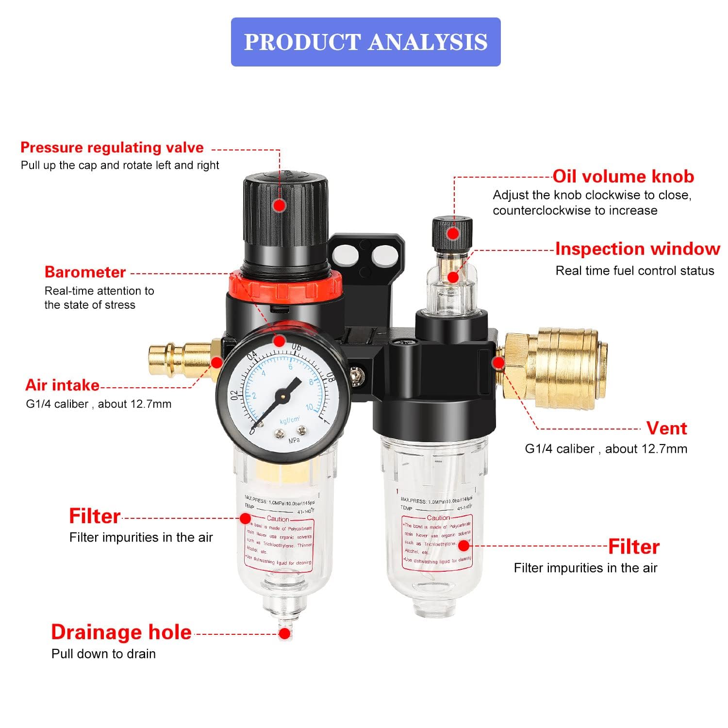 - 1 x 1/4 di pollice riduttore di pressione dell'aria compressa separatore d'acqua aria compressa