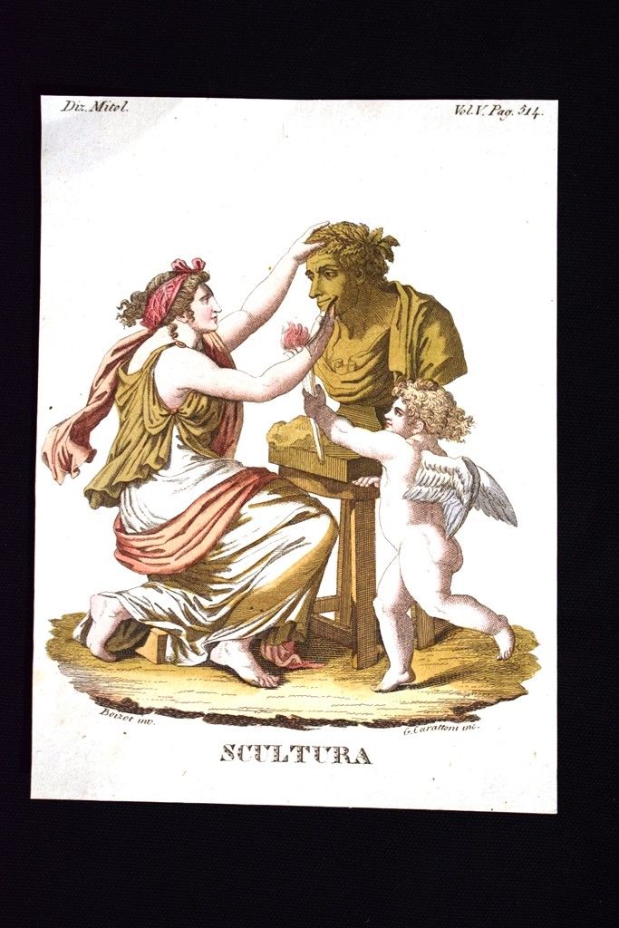 Allegoria della Scultura, rappresentata come una donna intenta a modellare un busto mentre il Genio dell'arte, sottoforma di un leggiadro fanciullo, la va illuminando con una torcia