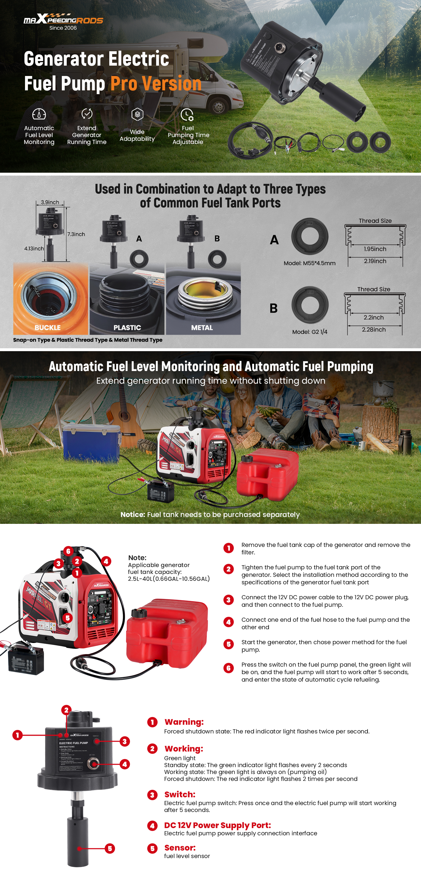 【Automated Design】The sensor inside the electronic fuel pump will always monitor the fuel level in the fuel tank and automatically pump fuel, which can extend the running time of the generator without shutting down. The external fuel tank capacity from 5-17GAL can be selected to meet the continuous running time. Note: check the fuel tank depth and fuel cap thread match the fuel pump.