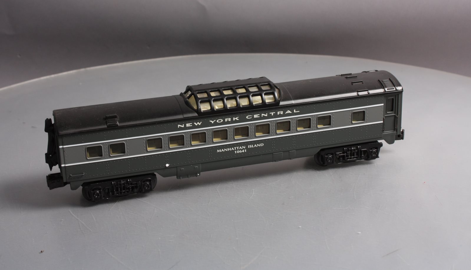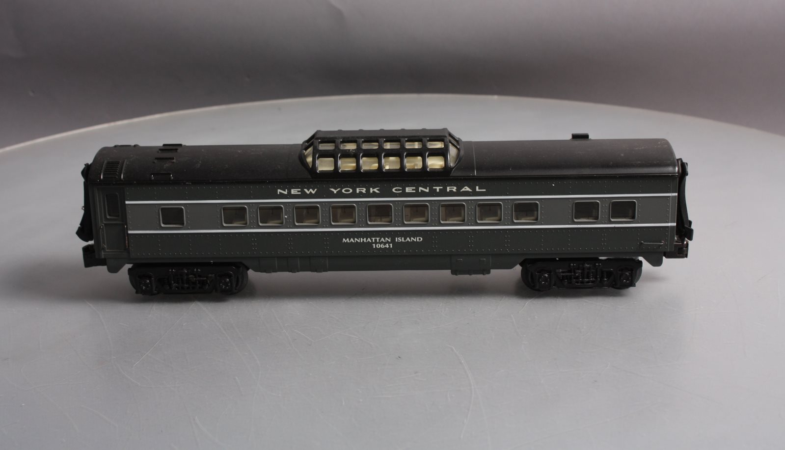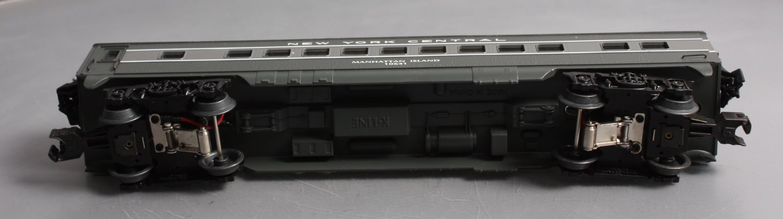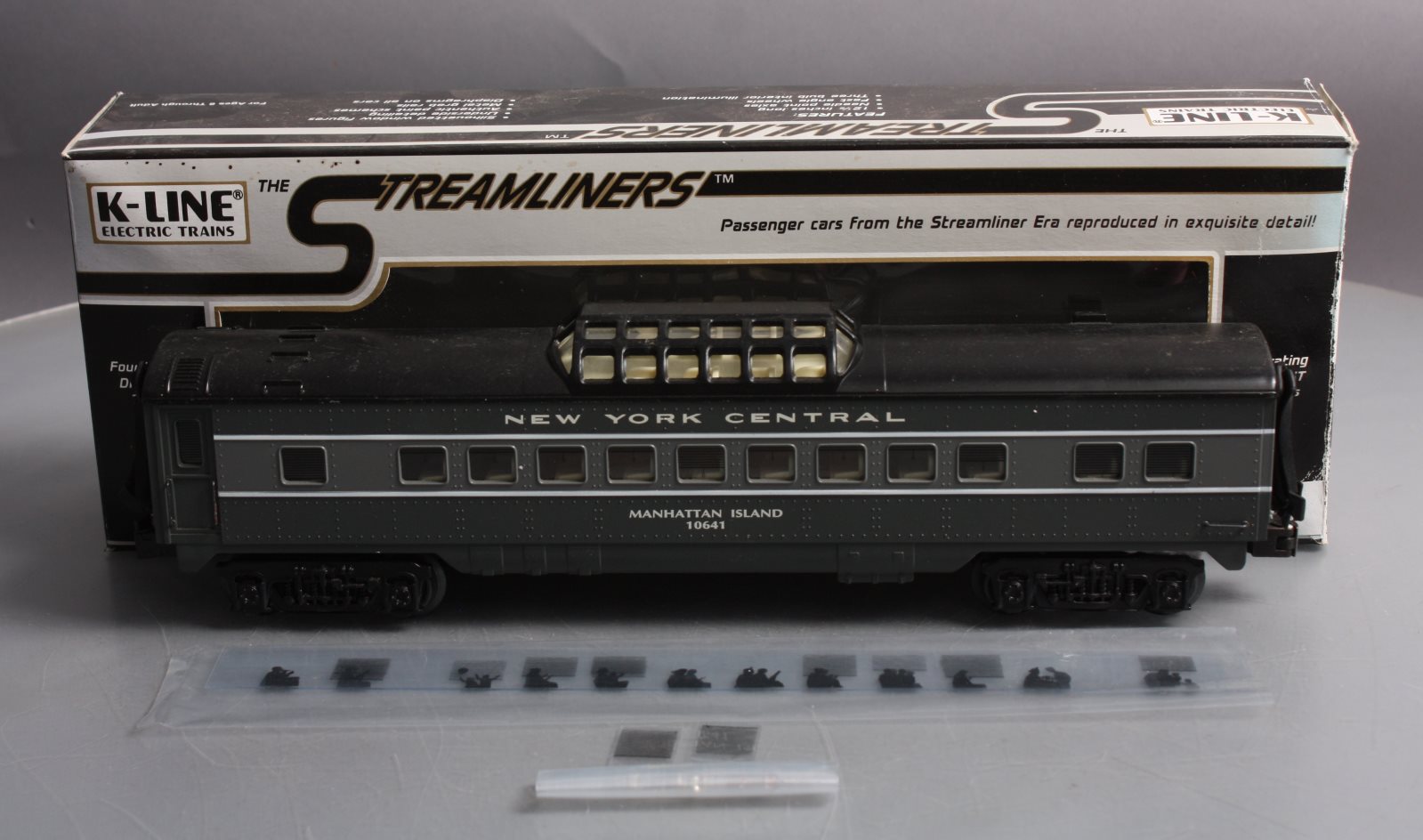 This is a K-Line K4570-10641 O NYC "Manhattan Island" Streamliner Vista Dome Car #10641. This item features fast angle wheels, silhouetted window figures, metal grab rails, 3 bulb illumination and rubber diaphrams.