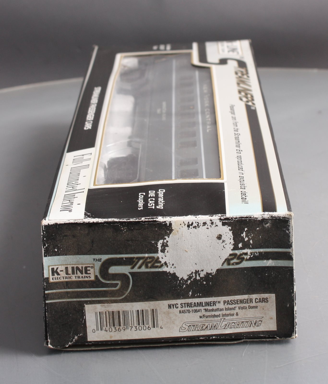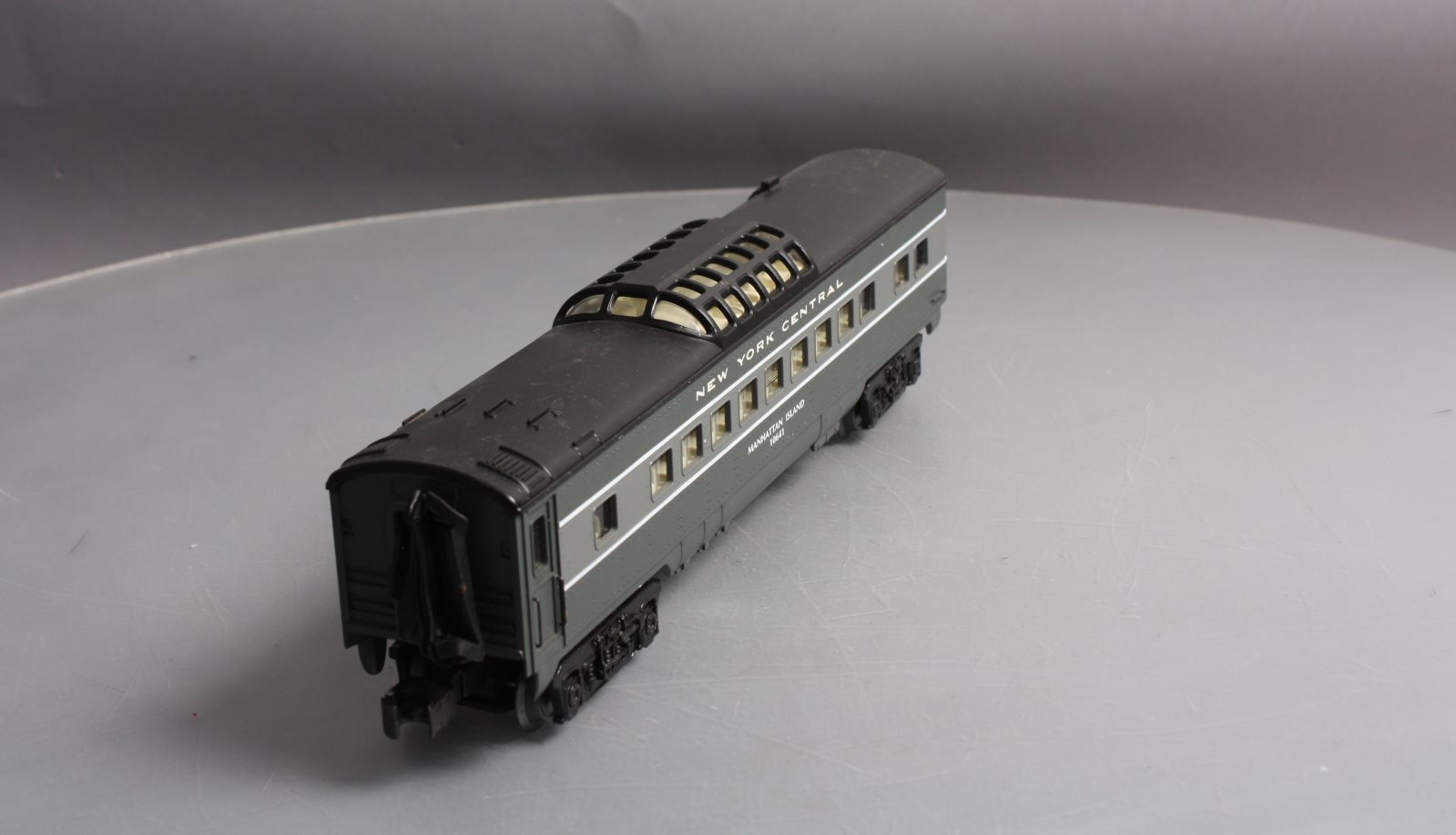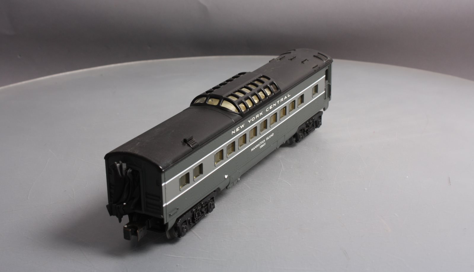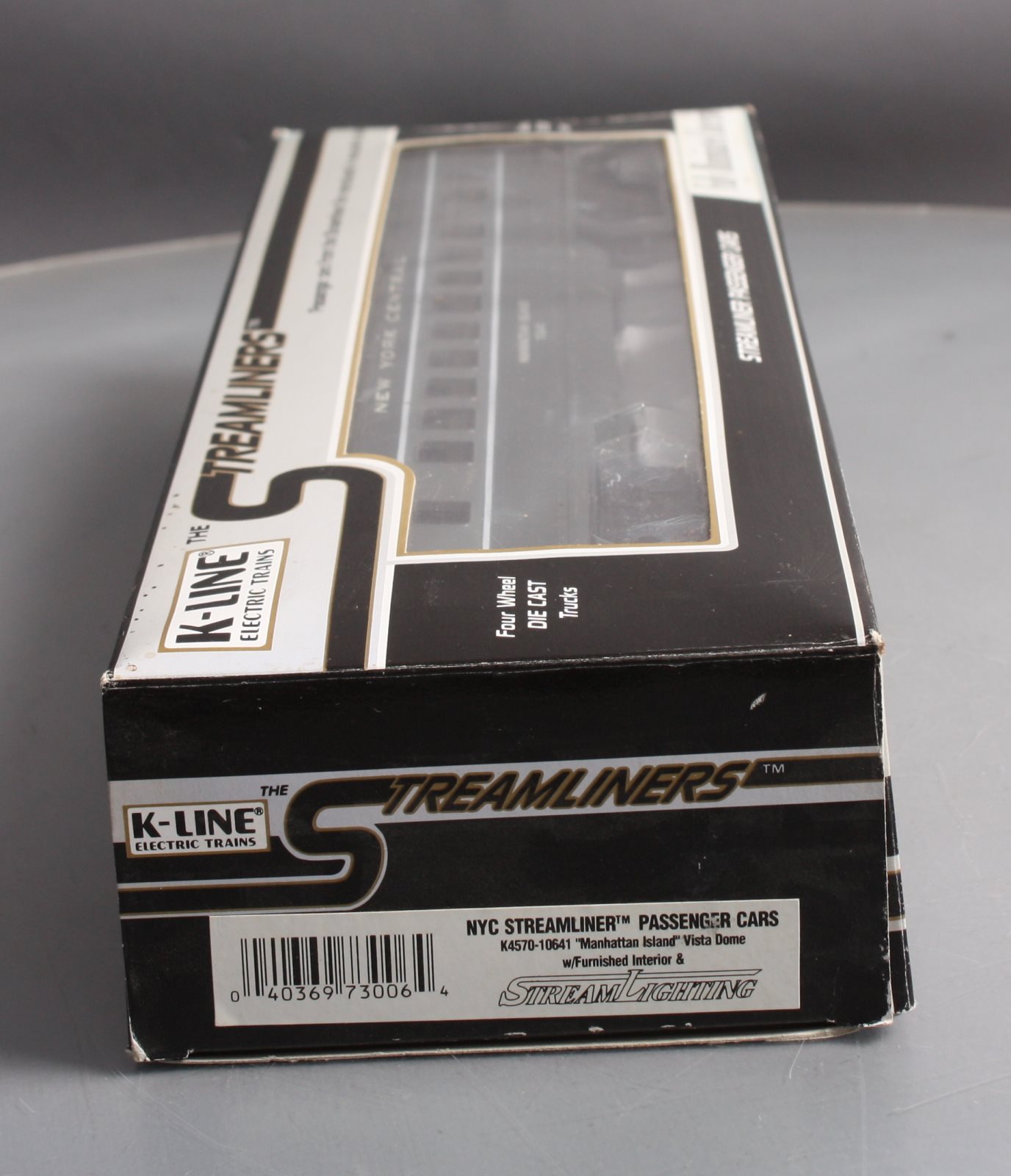 This is a K-Line K4570-10641 O NYC "Manhattan Island" Streamliner Vista Dome Car #10641. This item features fast angle wheels, silhouetted window figures, metal grab rails, 3 bulb illumination and rubber diaphrams.