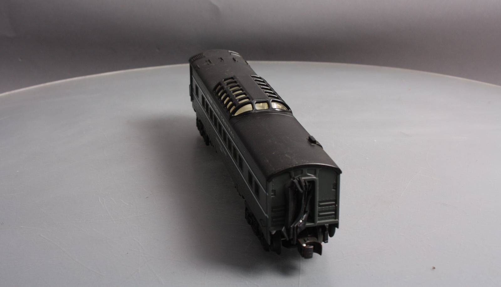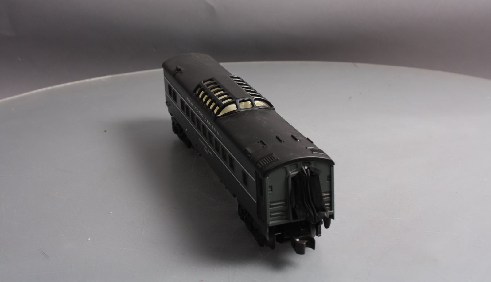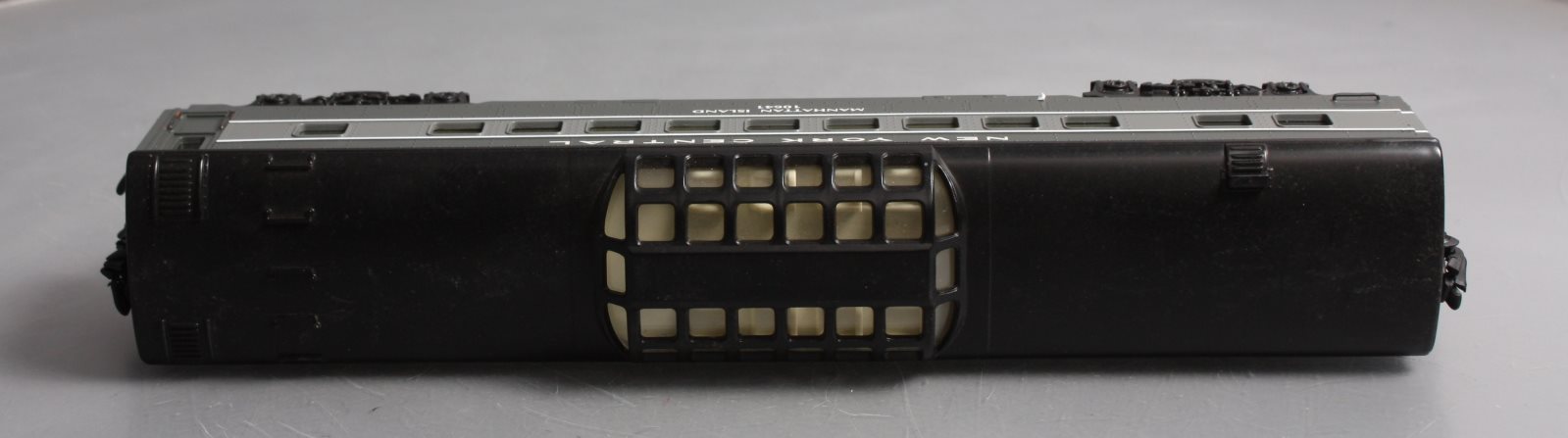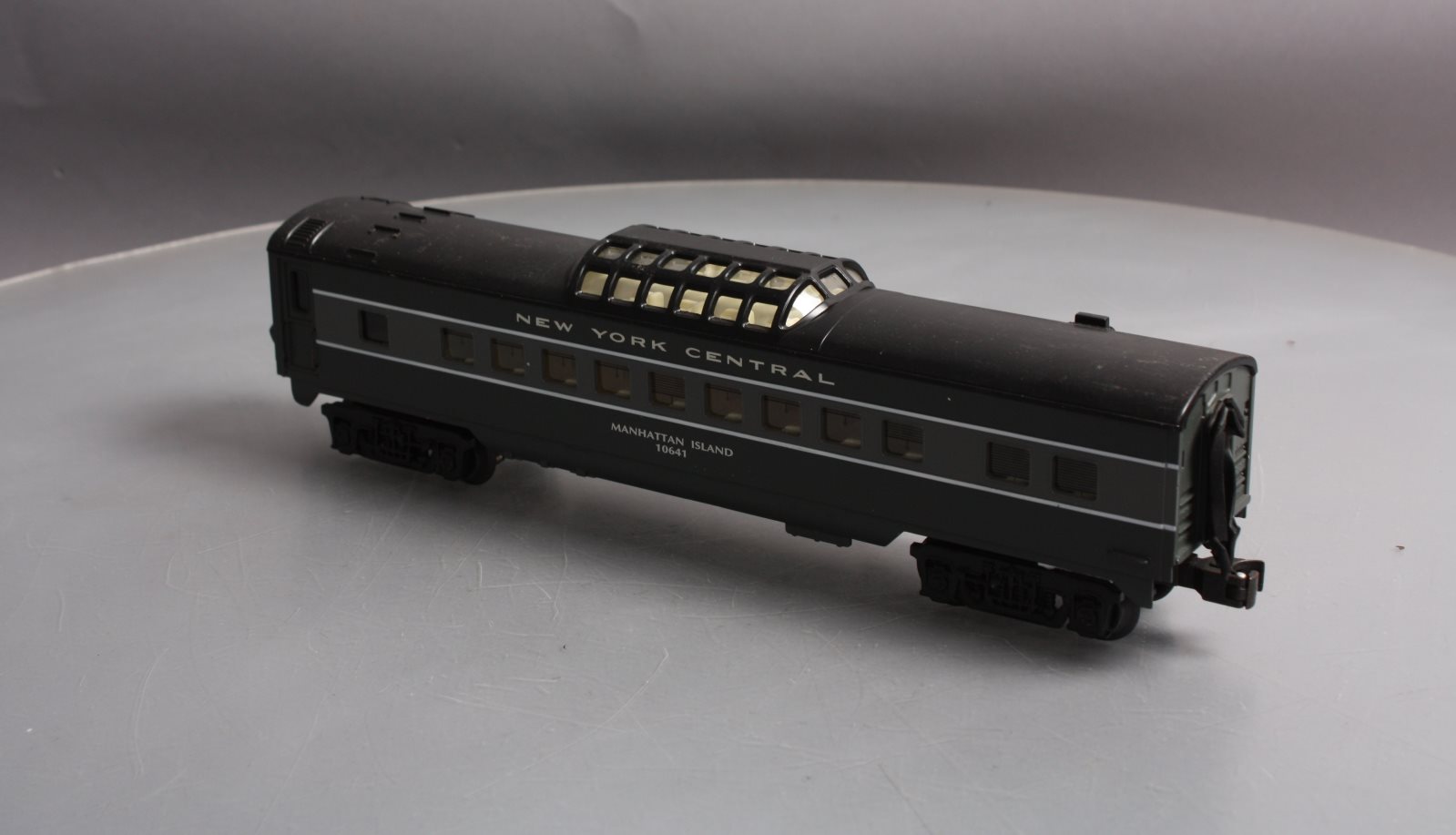 This is a K-Line K4570-10641 O NYC "Manhattan Island" Streamliner Vista Dome Car #10641. This item features fast angle wheels, silhouetted window figures, metal grab rails, 3 bulb illumination and rubber diaphrams.