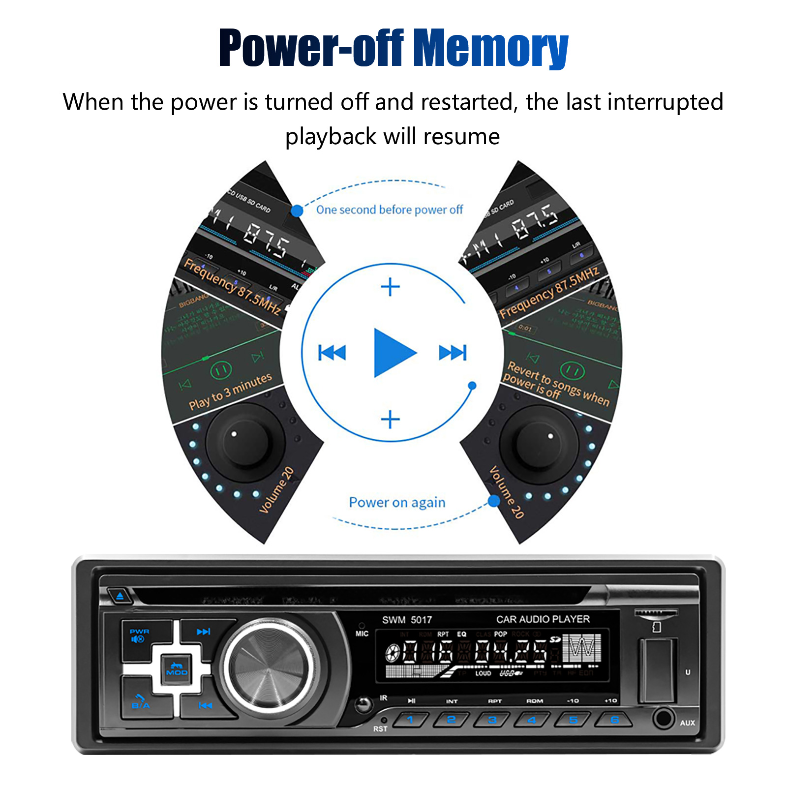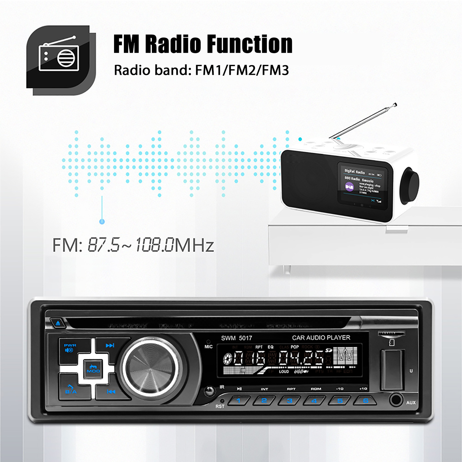 MEDIA PLAYBACKS--Multi-format playbacks for your choices. Be compatible with most Bluetooth devices. Allowing music steaming. Enjoy a pop in your favorite CD or via USB port, FM radio stations with up-to-date songs/news/sports/weather etc. Digital clock display, the default EQ (POP / ROCK / CLASS) Four-channel sound.