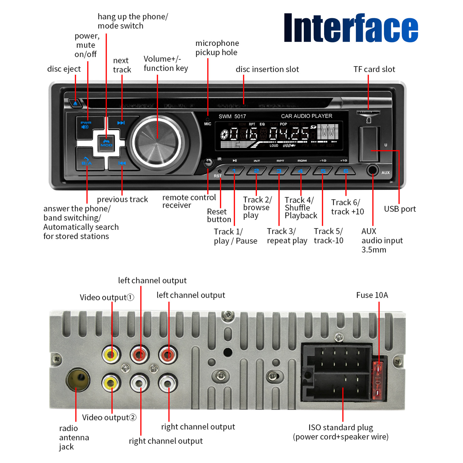 INPUTS&OUTPUTS--AUX access: Audio input interface, one of the most convenient way to hook up to your MP3 player, with most smartphones compatible. Simply use---Plug in and Start your music journey. More ports with more choices. Have a Vast Library of Audio Files at Your Fingertips or charge your phone. An amplifier is recommended to make sure your speakers are well powered. Seven-color key backlights adjustable.