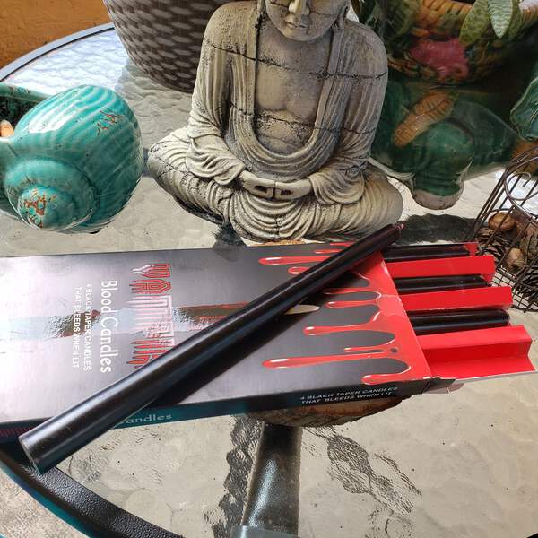 Pack of 4 Vampire Tears candles with an approximate burn time of 4 hours per candle. Once these black candles are lit and the wax begins to melt it turns red giving them their name 'Vampire Candles'.