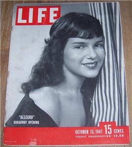 Life Magazine October 13, 1947. Allegro Broadway Opening On cover. Articles inside include China, Rexall Drugstore Hollywood Opening, Karate, Allen Funt, Buffalo New York Cops, Pablo Picasso, The Pacific Northwest, and more. Filled with great period advertising and Life's Famous photographs. Magazine is in good condition, wear at edges, light soiling on back cover