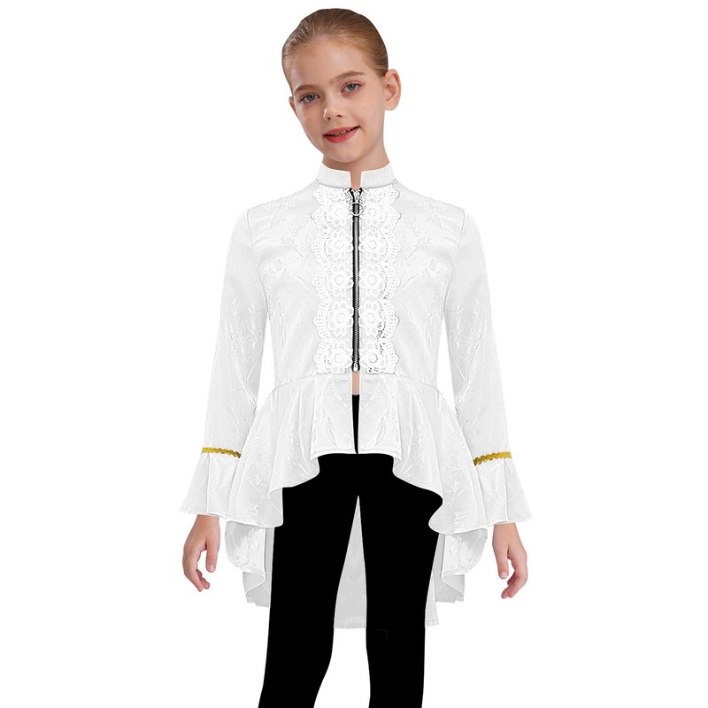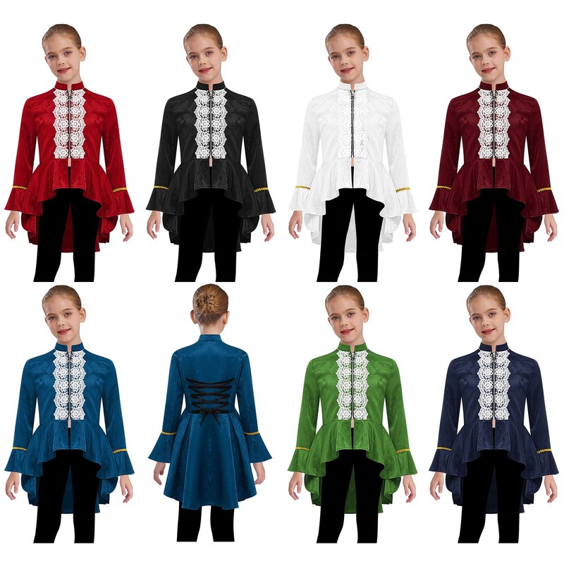 Stand collar, long sleeves, flared sleeves, medieval styled high-low hem jacket for girl.