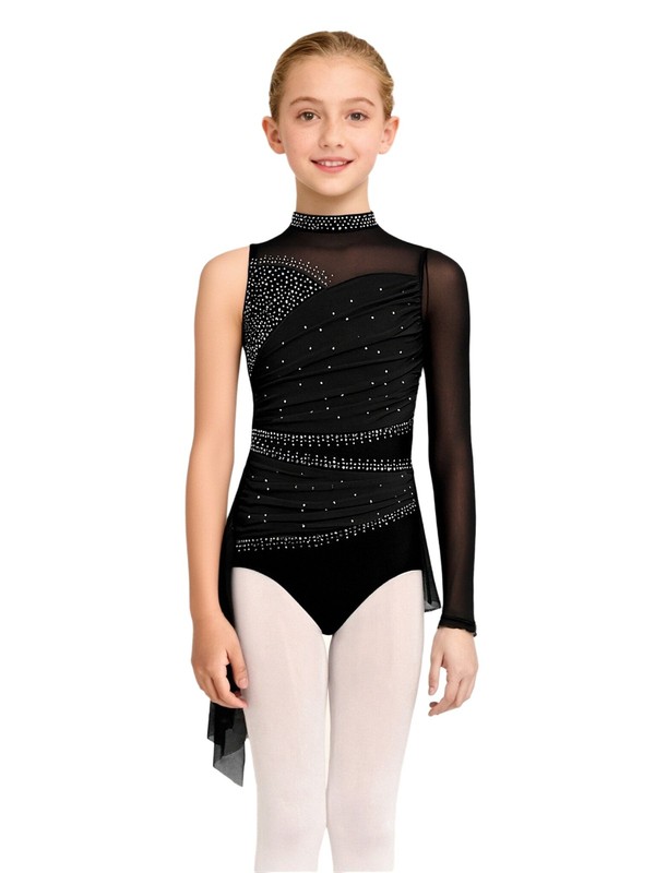 Girl’s asymmetrical dance leotard with long sleeve on one side and sleeveless on the other. The asymmetrical panel skirt on the back, showing the beauty of dance.