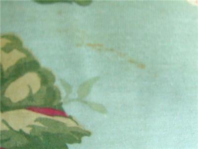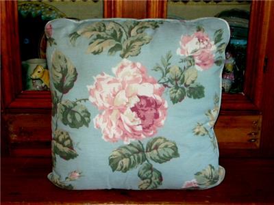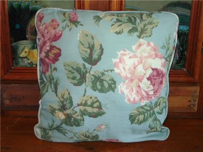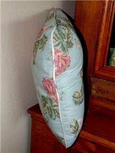 Lovely cottagey vintage sturdy soft aqua blue cotton accent pillow measuring 16" square and about 5-6" deep. Featuring a charming large pink roses floral pattern, it is cord trimmed in the same fabric and stuffed with a medium weight pillow fill. Hand stitched closed on one side and machine constructed, condition is very nice with no holes, tears, or smells -- no smokers or pets here - one very faint short line stain which is difficult to see - please note - the cover cannot be removed to wash, as it is sewn closed on all sides. Hoping someone will love this as I have -- it looks wonderful in a pink bedroom, which is how it has always been display! Lovely addition to any home!