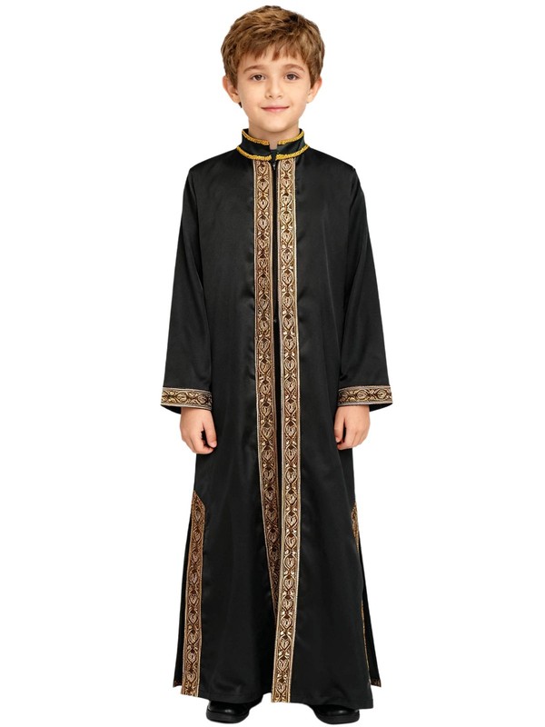 Set Include: 1Pc Boys ThobeCondition: New with tagsMaterial: 96% Polyester, 4% SpandexFeatures:Made from a blend of polyester and spandex, the thobe is soft and comfortable, allowing your boy to move freely during various activities. A Muslim thobe Arab thobe for child size, stand collar, long sleeves maxi Kaftans, with slit design at front and two sides.The front zipper detail only provides easy on-and-off but also adds a modern and trendy element to the traditional thobe style.The gold embroidery on the thobe creates a luxurious and eye-catching look, perfect for special festivals and holidays.Suitable for Islamic festivals, religious holidays, cultural events, daily wear, casual, family gathering, parties, etc.